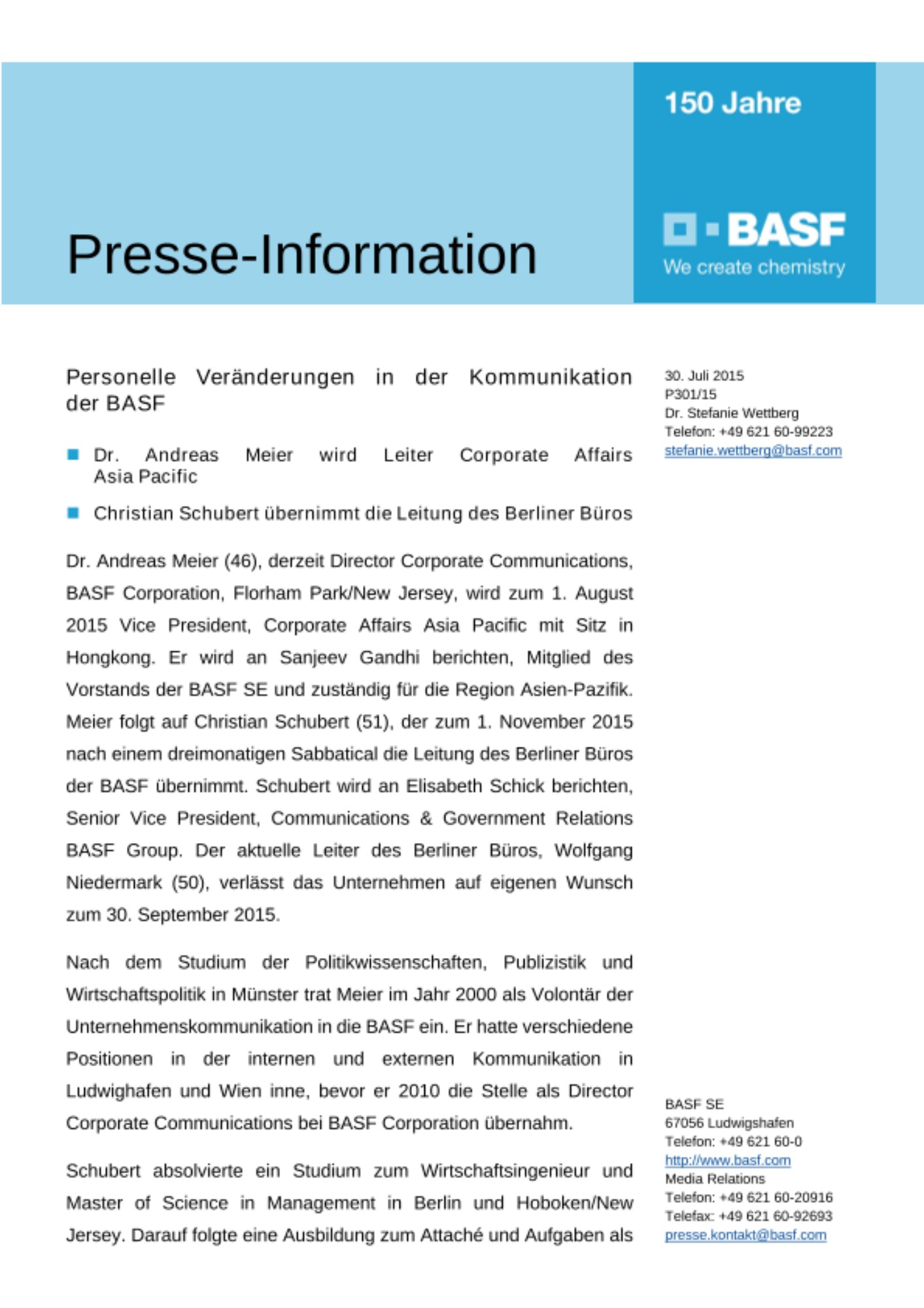 Dr. Andreas Meier (46), derzeit Director Corporate Communications, BASF Corporation, Florham Park/New Jersey, wird zum 1. August 2015 Vice President, Corporate Affairs Asia Pacific mit Sitz in Hongkong. Er wird an Sanjeev Gandhi berichten, Mitglied des Vorstands der BASF SE und zuständig für die Region Asien-Pazifik. Meier folgt auf Christian Schubert (51), der zum 1. November 2015 nach einem dreimonatigen Sabbatical die Leitung des Berliner Büros der BASF übernimmt. Schubert wird an Elisabeth Schick berichten, Senior Vice President, Communications & Government Relations BASF Group. Der aktuelle Leiter des Berliner Büros, Wolfgang Niedermark (50), verlässt das Unternehmen auf eigenen Wunsch zum 30. September 2015.