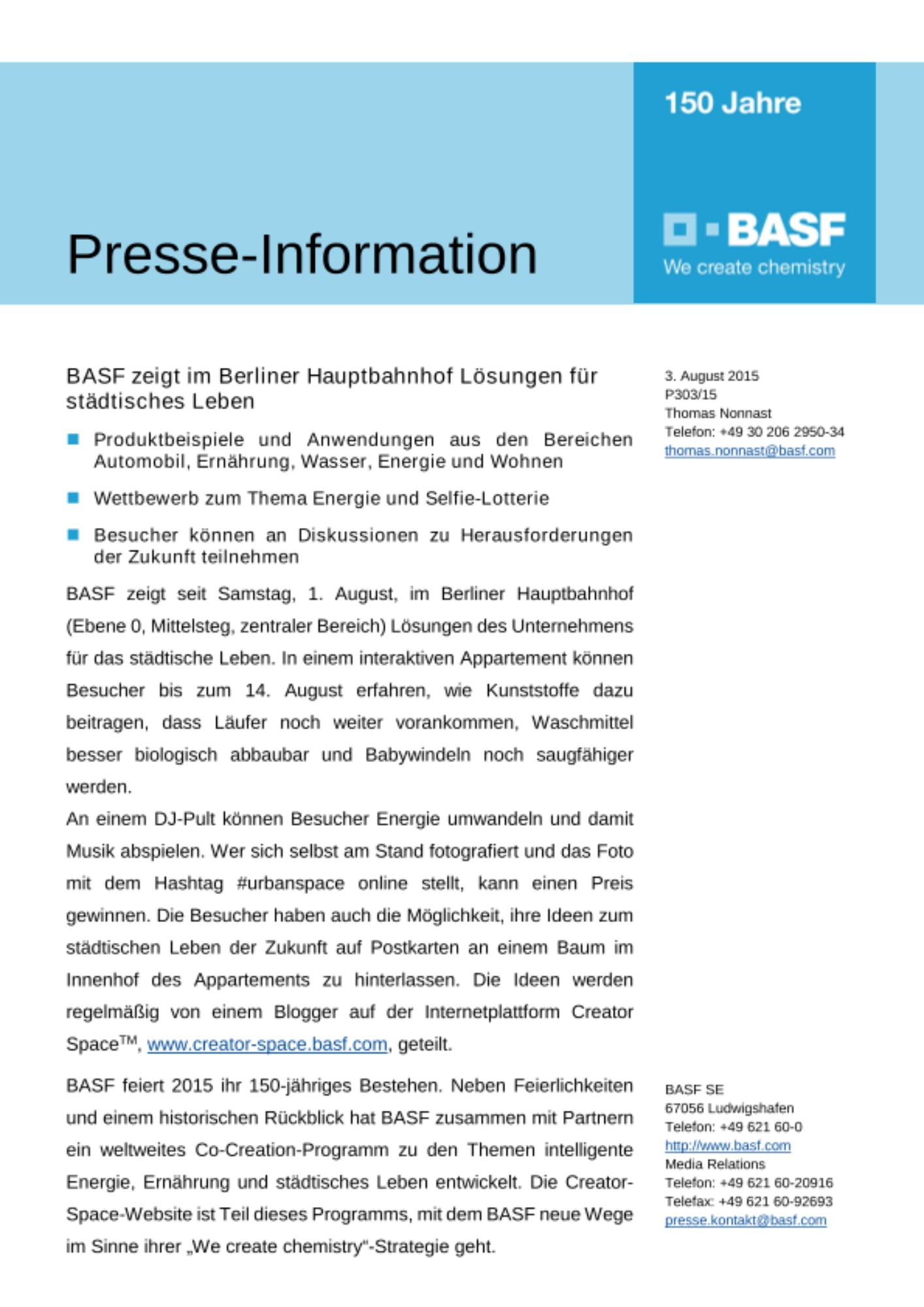 BASF feiert 2015 ihr 150-jähriges Bestehen. Neben Feierlichkeiten und einem historischen Rückblick hat BASF zusammen mit Partnern ein weltweites Co-Creation-Programm zu den Themen intelligente Energie, Ernährung und städtisches Leben entwickelt. Die Creator-Space-Website ist Teil dieses Programms, mit dem BASF neue Wege im Sinne ihrer „We create chemistry“-Strategie geht.