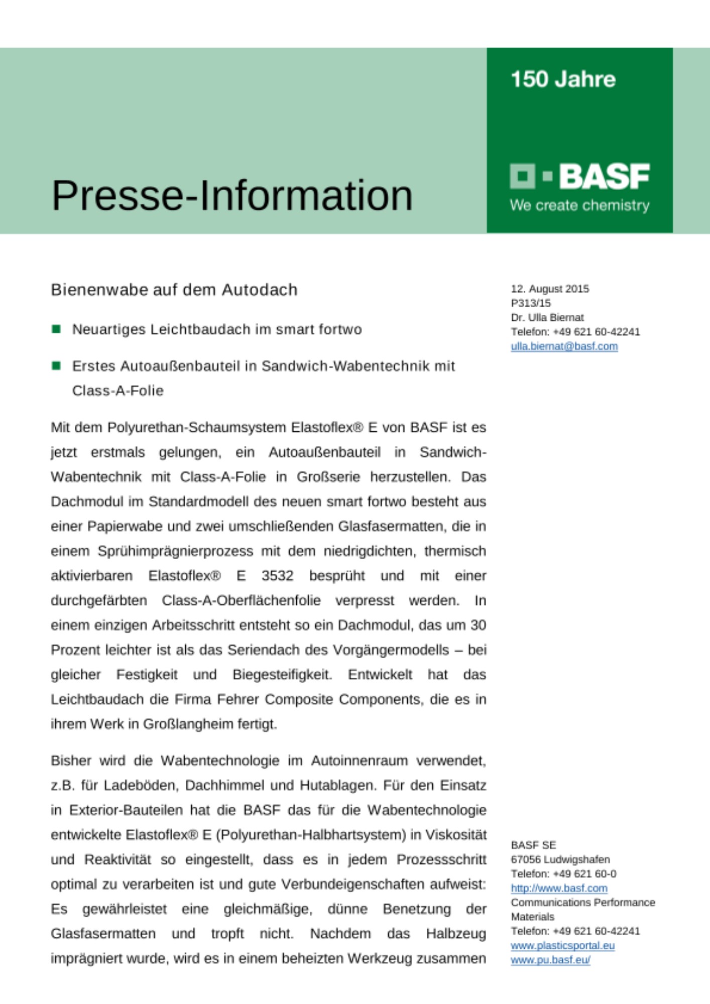Mit dem Polyurethan-Schaumsystem Elastoflex® E von BASF ist es jetzt erstmals gelungen, ein Autoaußenbauteil in Sandwich-Wabentechnik mit Class-A-Folie in Großserie herzustellen. Das Dachmodul im Standardmodell des neuen smart fortwo besteht aus einer Papierwabe und zwei umschließenden Glasfasermatten, die in einem Sprühimprägnierprozess mit dem niedrigdichten, thermisch aktivierbaren Elastoflex® E 3532 besprüht und mit einer durchgefärbten Class-A-Oberflächenfolie verpresst werden. In einem einzigen Arbeitsschritt entsteht so ein Dachmodul, das um 30 Prozent leichter ist als das Seriendach des Vorgängermodells – bei gleicher Festigkeit und Biegesteifigkeit. Entwickelt hat das Leichtbaudach die Firma Fehrer Composite Components, die es in ihrem Werk in Großlangheim fertigt.