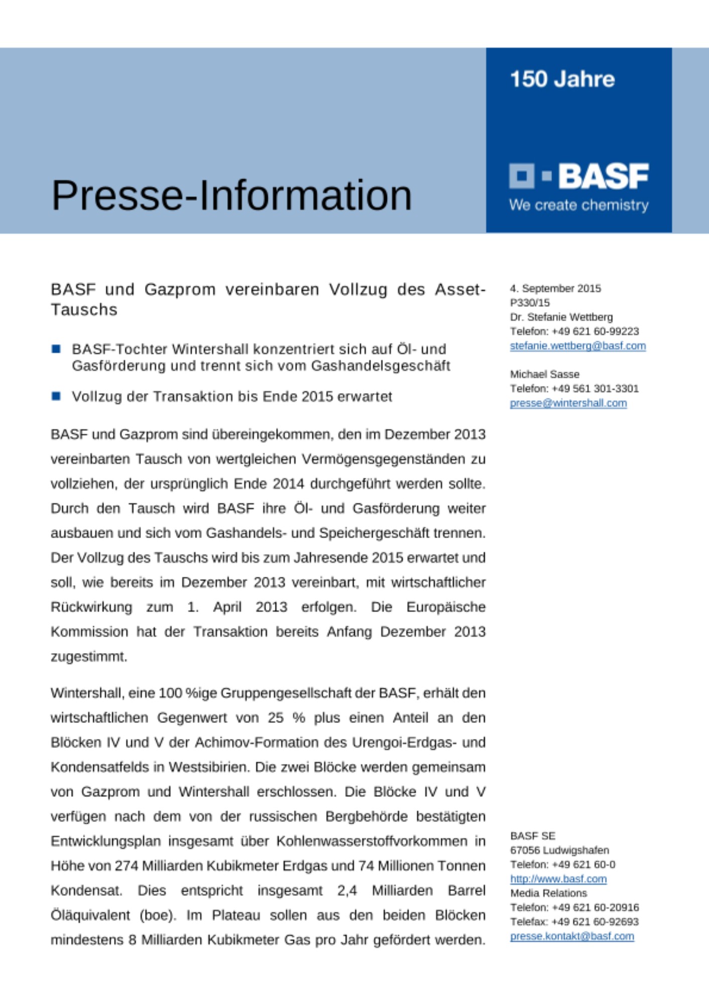 BASF und Gazprom sind übereingekommen, den im Dezember 2013 vereinbarten Tausch von wertgleichen Vermögensgegenständen zu vollziehen, der ursprünglich Ende 2014 durchgeführt werden sollte. Durch den Tausch wird BASF ihre Öl- und Gasförderung weiter ausbauen und sich vom Gashandels- und Speichergeschäft trennen. Der Vollzug des Tauschs wird bis zum Jahresende 2015 erwartet und soll, wie bereits im Dezember 2013 vereinbart, mit wirtschaftlicher Rückwirkung zum 1. April 2013 erfolgen. Die Europäische Kommission hat der Transaktion bereits Anfang Dezember 2013 zugestimmt.