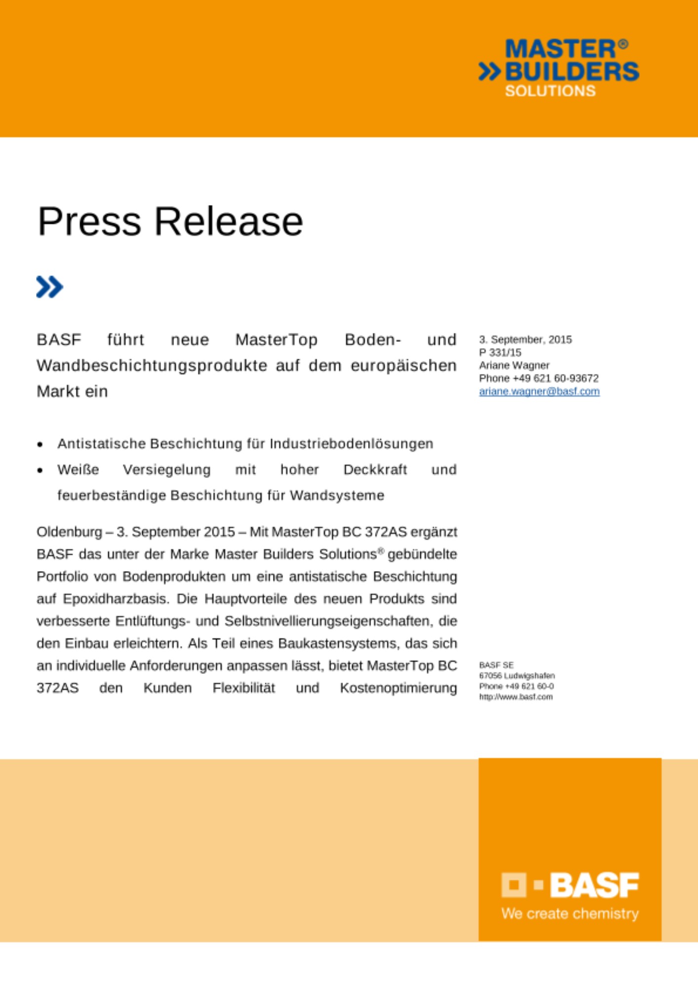Oldenburg – 3. September 2015 – Mit MasterTop BC 372AS ergänzt BASF das unter der Marke Master Builders Solutions® gebündelte Portfolio von Bodenprodukten um eine antistatische Beschichtung auf Epoxidharzbasis. Die Hauptvorteile des neuen Produkts sind verbesserte Entlüftungs- und Selbstnivellierungseigenschaften, die den Einbau erleichtern. Als Teil eines Baukastensystems, das sich an individuelle Anforderungen anpassen lässt, bietet MasterTop BC 372AS den Kunden Flexibilität und Kostenoptimierung gleichermaßen. Zudem erfüllt es die hohen Emissions-schutzanforderungen des AgBB-Schemas (Ausschuss zur gesundheitlichen Bewertung von Bauprodukten) und ist im Sinne der Arbeitssicherheit auch in rutschfester Ausführung erhältlich. MasterTop BC 372AS ist in nahezu allen RAL- und NCS-Farben lieferbar und bietet damit kreativen Spielraum. Die antistatischen Eigenschaften (Erdungswiderstand) von MasterTop BC 372AS entsprechen der Norm EN 1081 und eignen sich damit optimal, um statische Elektrizität in Lagerräumen zu minimieren und sind ideal für Einbauten in Industrieanlagen, in denen die Gefahr einer Staub- oder Lösemittelexplosion besteht, wie beispielsweise in der pharmazeutischen Industrie.