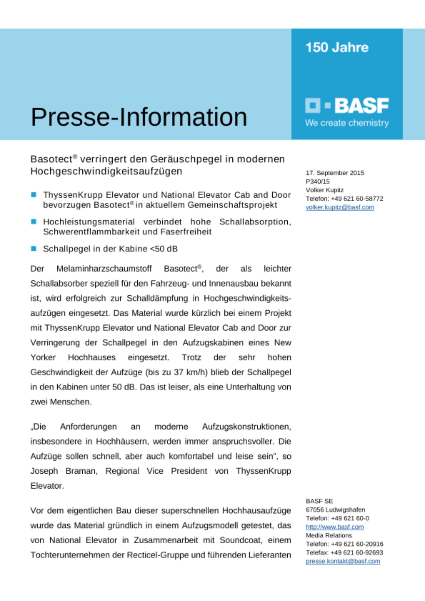 Der Melaminharzschaumstoff Basotect®, der als leichter Schallabsorber speziell für den Fahrzeug- und Innenausbau bekannt ist, wird erfolgreich zur Schalldämpfung in Hochgeschwindigkeits-aufzügen eingesetzt. Das Material wurde kürzlich bei einem Projekt mit ThyssenKrupp Elevator und National Elevator Cab and Door zur Verringerung der Schallpegel in den Aufzugskabinen eines New Yorker Hochhauses eingesetzt. Trotz der sehr hohen Geschwindigkeit der Aufzüge (bis zu 37 km/h) blieb der Schallpegel in den Kabinen unter 50 dB. Das ist leiser, als eine Unterhaltung von zwei Menschen.