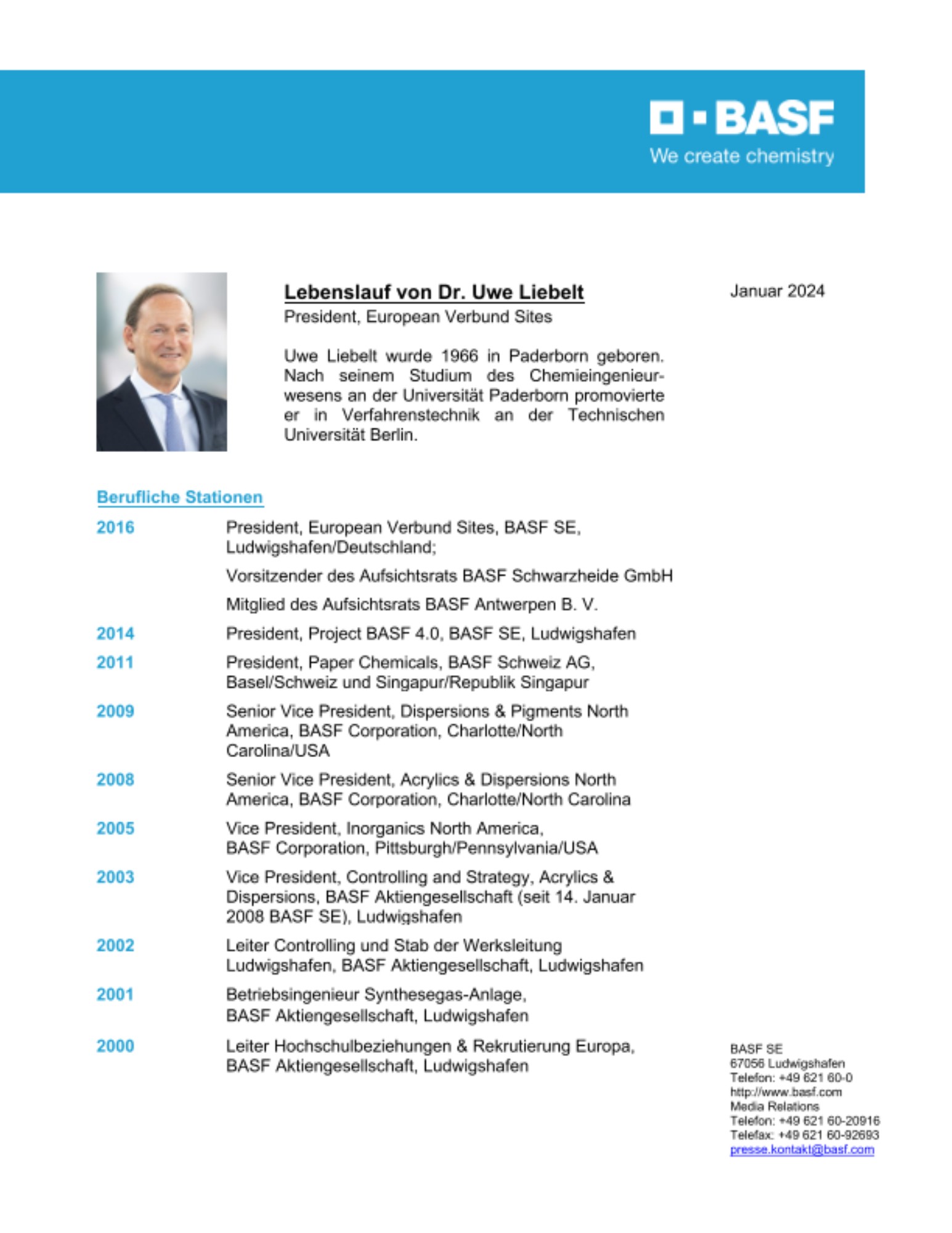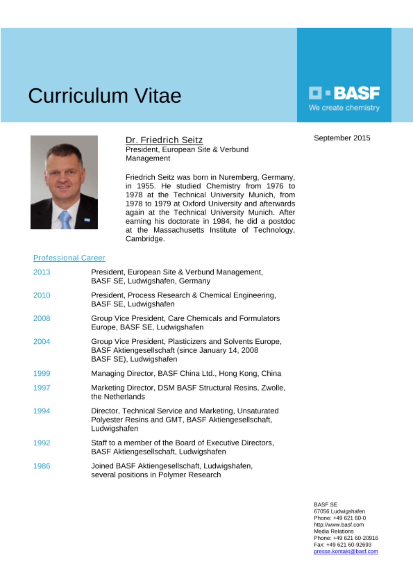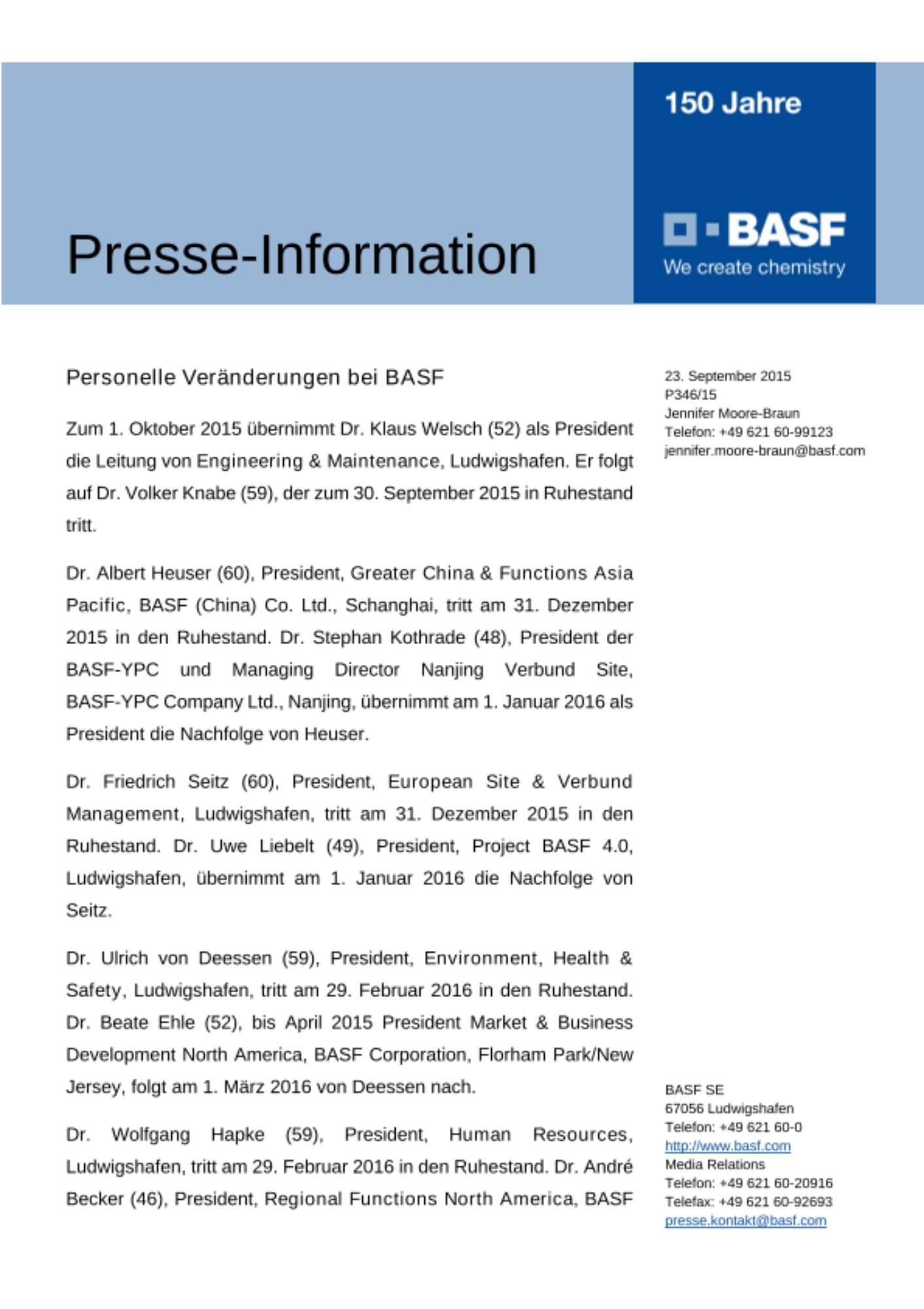 Dr. Friedrich Seitz (60), President, European Site & Verbund Management, Ludwigshafen, tritt am 31. Dezember 2015 in den Ruhestand. Dr. Uwe Liebelt (49), President, Project BASF 4.0, Ludwigshafen, übernimmt am 1. Januar 2016 die Nachfolge von Seitz.