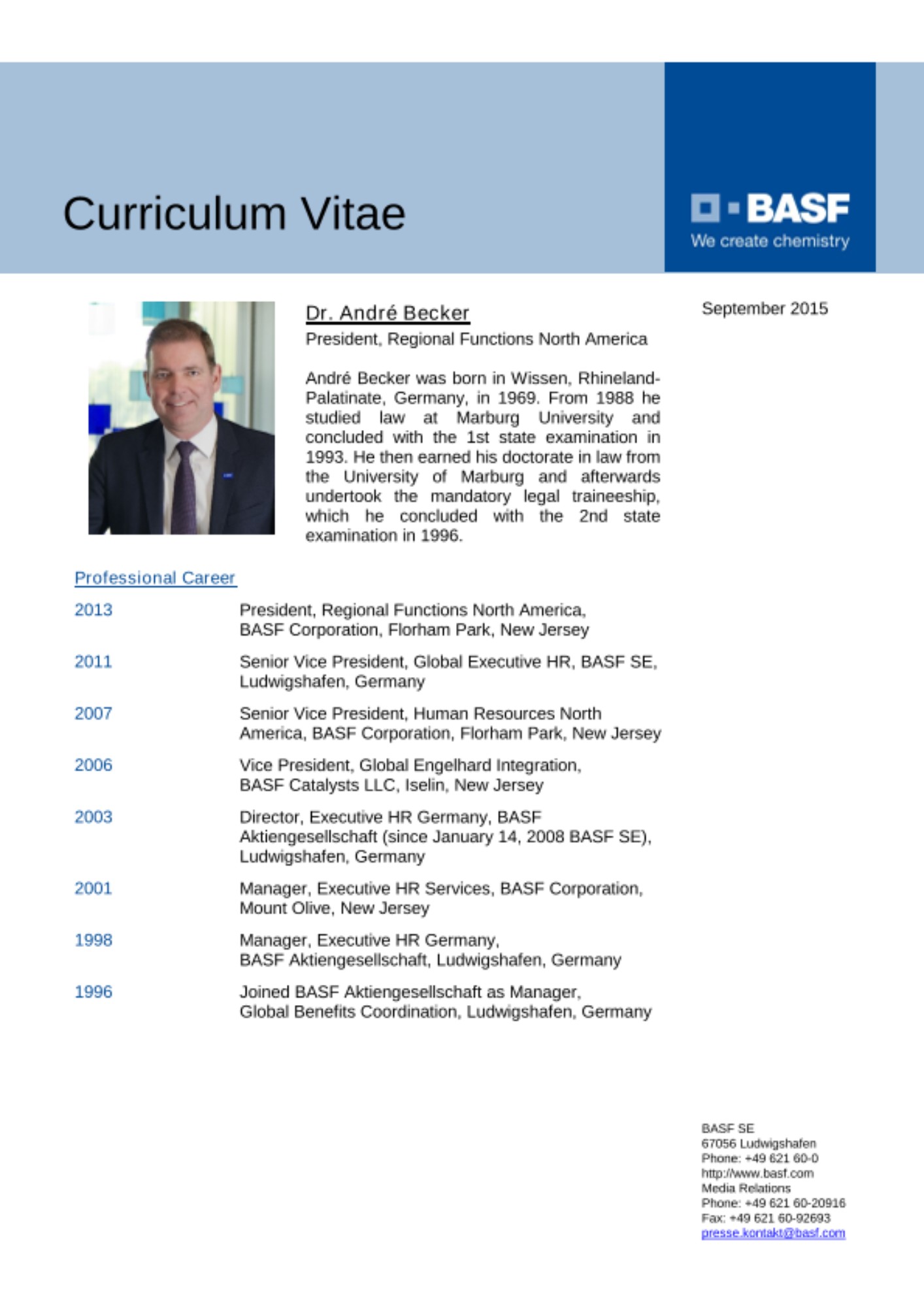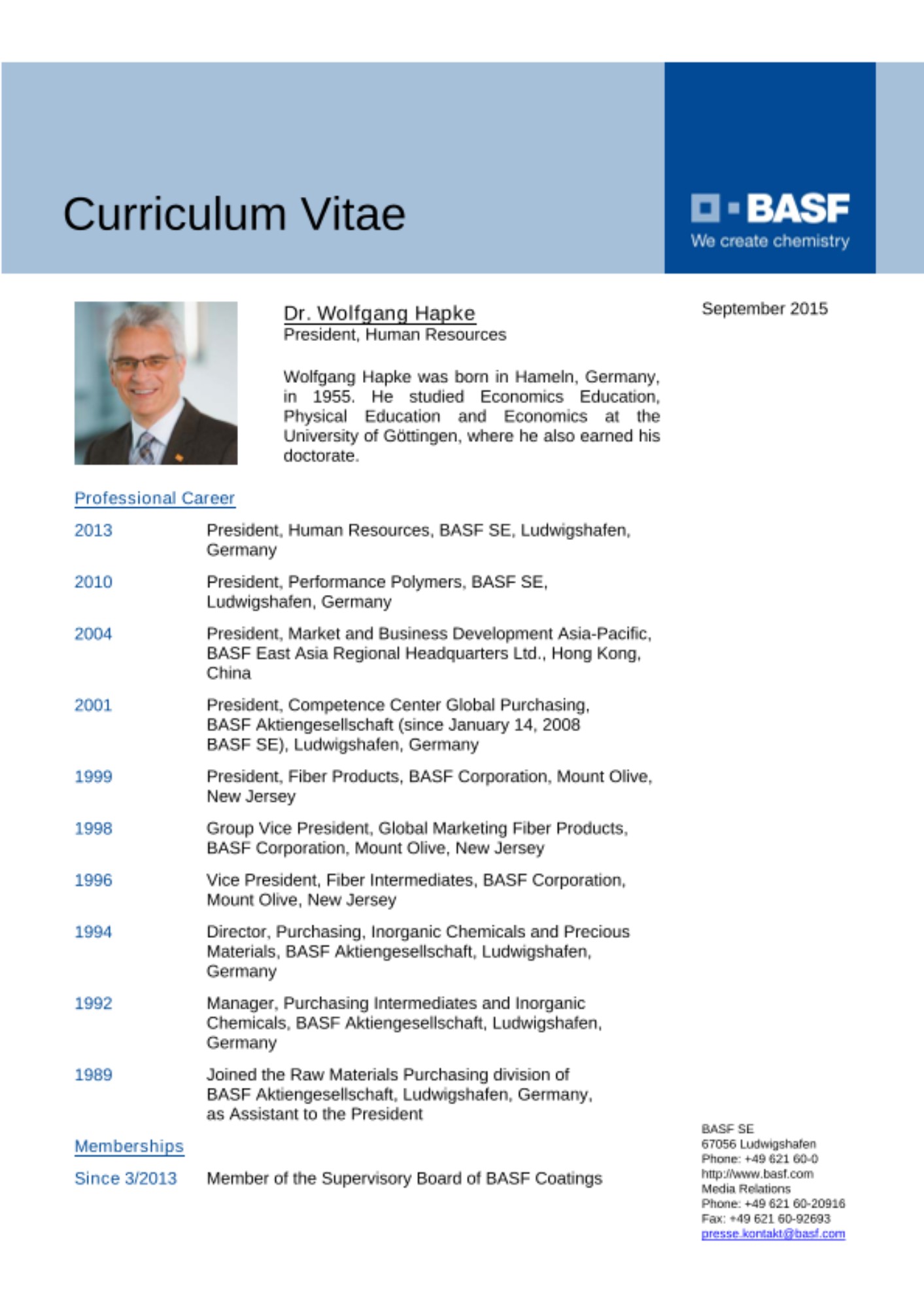 Dr. Wolfgang Hapke (59), President, Human Resources, Ludwigshafen, tritt am 29. Februar 2016 in den Ruhestand. Dr. André Becker (46), President, Regional Functions North America, BASF Corporation, Florham Park/New Jersey, übernimmt am 1. März 2016 die Nachfolge von Hapke.