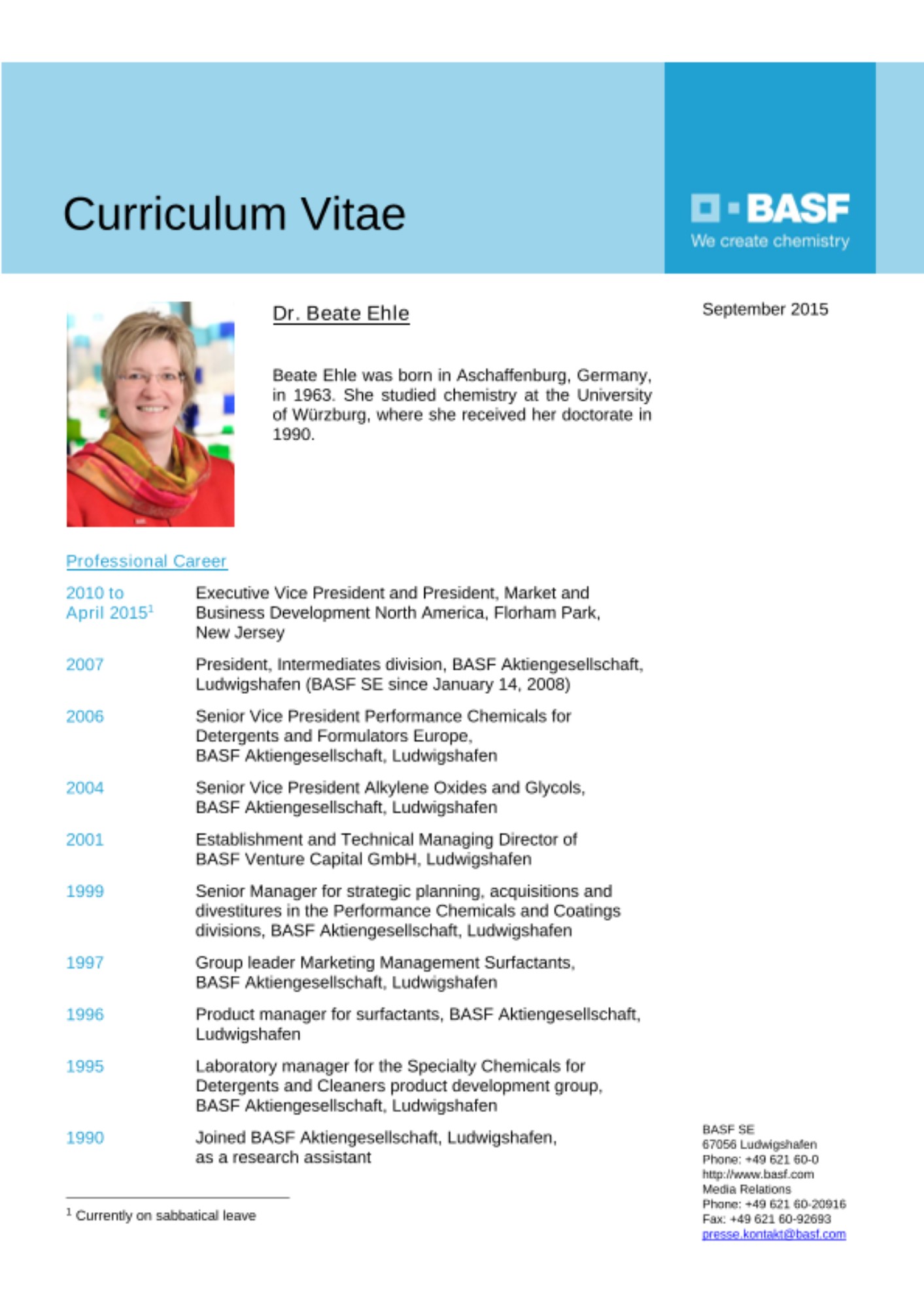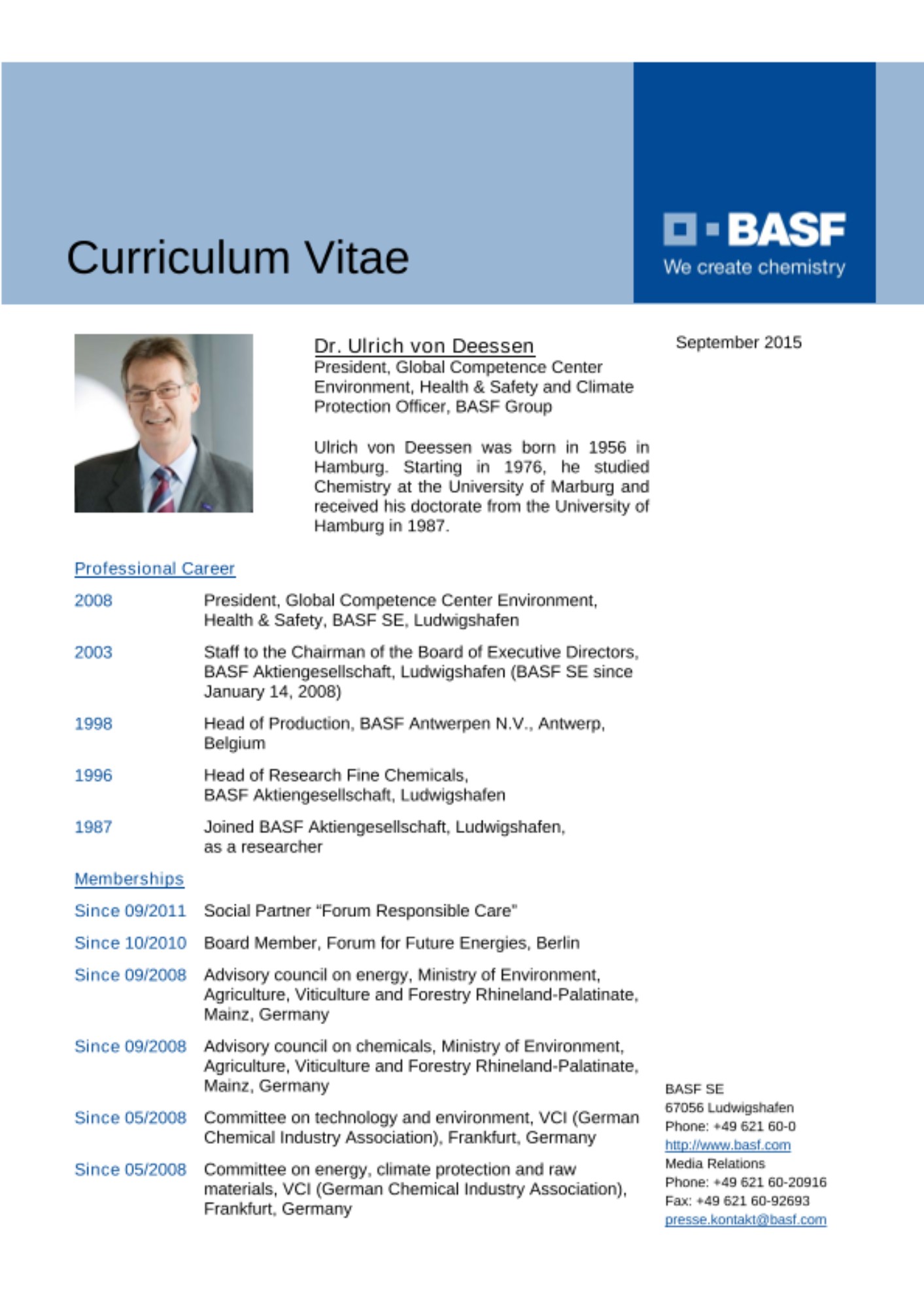 Dr. Ulrich von Deessen (59), President, Environment, Health & Safety, Ludwigshafen, tritt am 29. Februar 2016 in den Ruhestand. Dr. Beate Ehle (52), bis April 2015 President Market & Business Development North America, BASF Corporation, Florham Park/New Jersey, folgt am 1. März 2016 von Deessen nach.