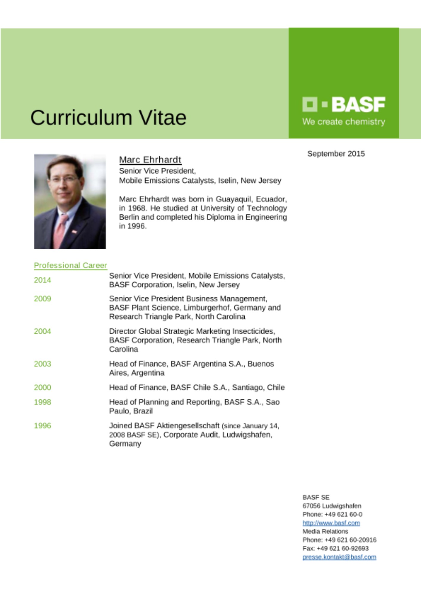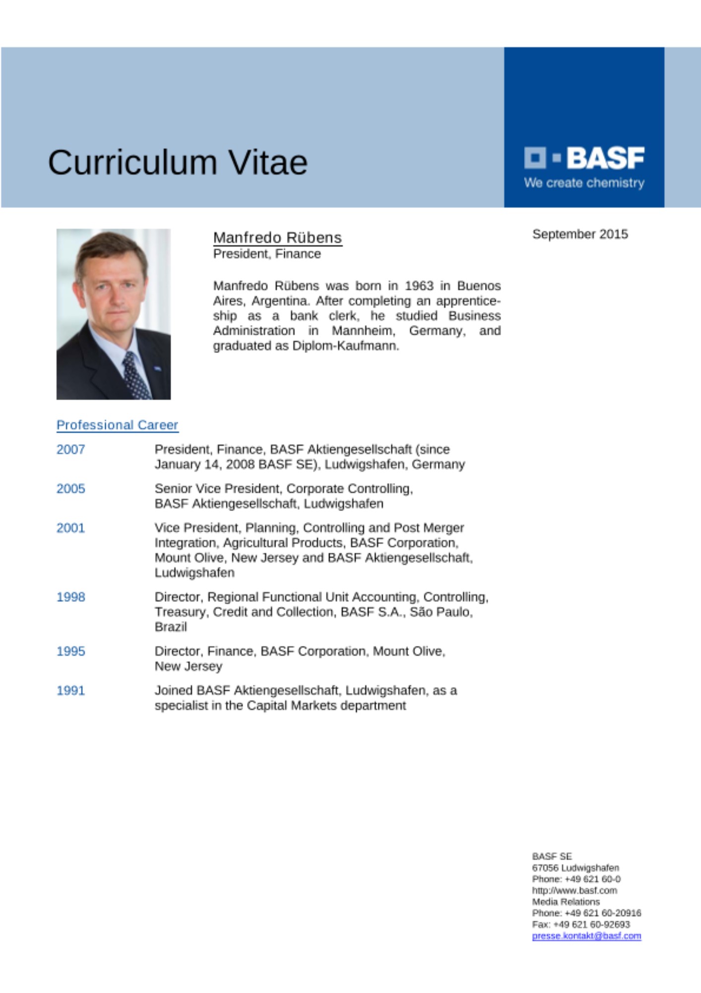 Manfredo Rübens (52), President, Finance, Ludwigshafen, übernimmt am 1. Januar 2016 die Nachfolge von Becker. Marc Ehrhardt (47), Senior Vice President, Mobile Emissions Catalysts, BASF Corporation, Iselin/New Jersey, übernimmt am 1. Dezember 2015 als President die Nachfolge von Rübens.