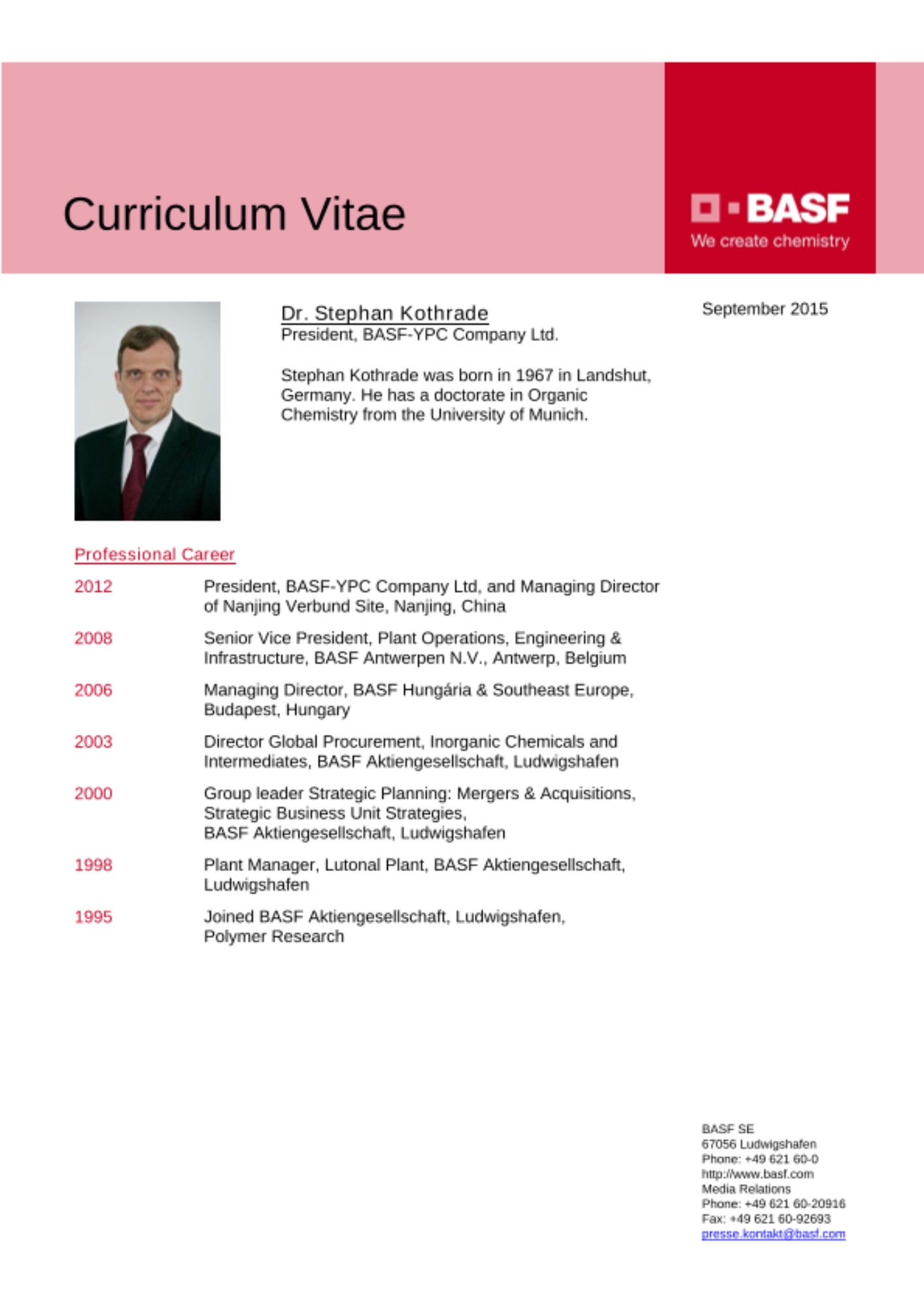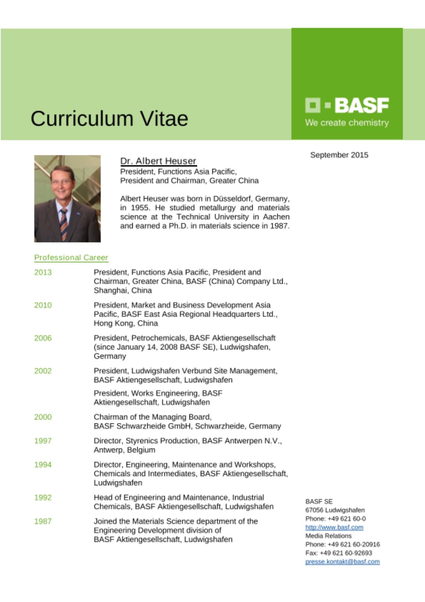 Dr. Albert Heuser (60), President, Greater China & Functions Asia Pacific, BASF (China) Co. Ltd., Schanghai, tritt am 31. Dezember 2015 in den Ruhestand. Dr. Stephan Kothrade (48), President der BASF-YPC und Managing Director Nanjing Verbund Site, BASF-YPC Company Ltd., Nanjing, übernimmt am 1. Januar 2016 als President die Nachfolge von Heuser.