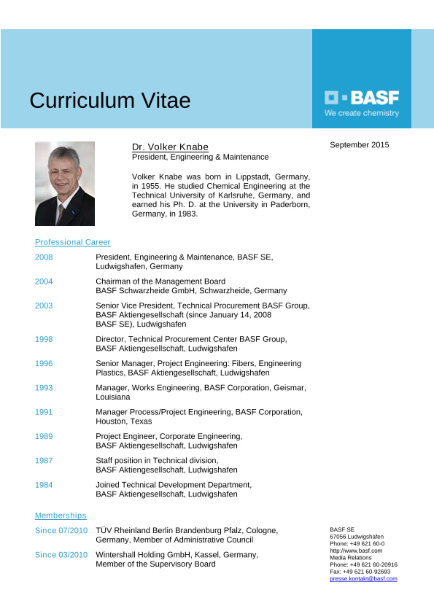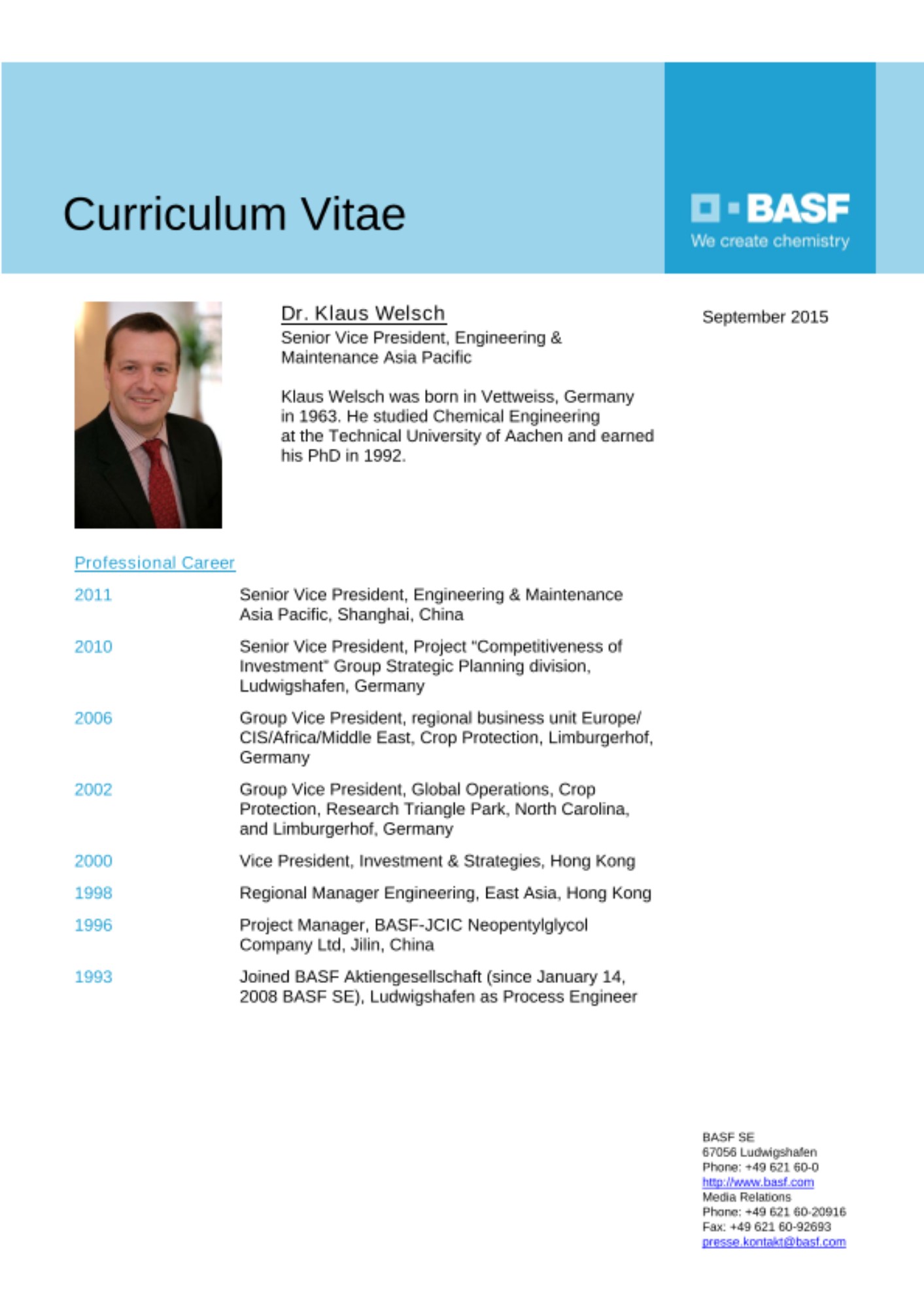 Zum 1. Oktober 2015 übernimmt Dr. Klaus Welsch (52) als President die Leitung von Engineering & Maintenance, Ludwigshafen. Er folgt auf Dr. Volker Knabe (59), der zum 30. September 2015 in Ruhestand tritt.