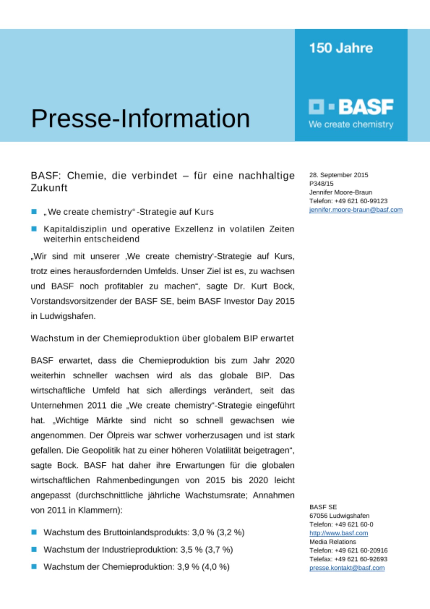 BASF erwartet, dass die Chemieproduktion bis zum Jahr 2020 weiterhin schneller wachsen wird als das globale BIP. Das wirtschaftliche Umfeld hat sich allerdings verändert, seit das Unternehmen 2011 die „We create chemistry“-Strategie eingeführt hat. „Wichtige Märkte sind nicht so schnell gewachsen wie angenommen. Der Ölpreis war schwer vorherzusagen und ist stark gefallen. Die Geopolitik hat zu einer höheren Volatilität beigetragen“, sagte Bock. BASF hat daher ihre Erwartungen für die globalen wirtschaftlichen Rahmenbedingungen von 2015 bis 2020 leicht angepasst (durchschnittliche jährliche Wachstumsrate; Annahmen von 2011 in Klammern):