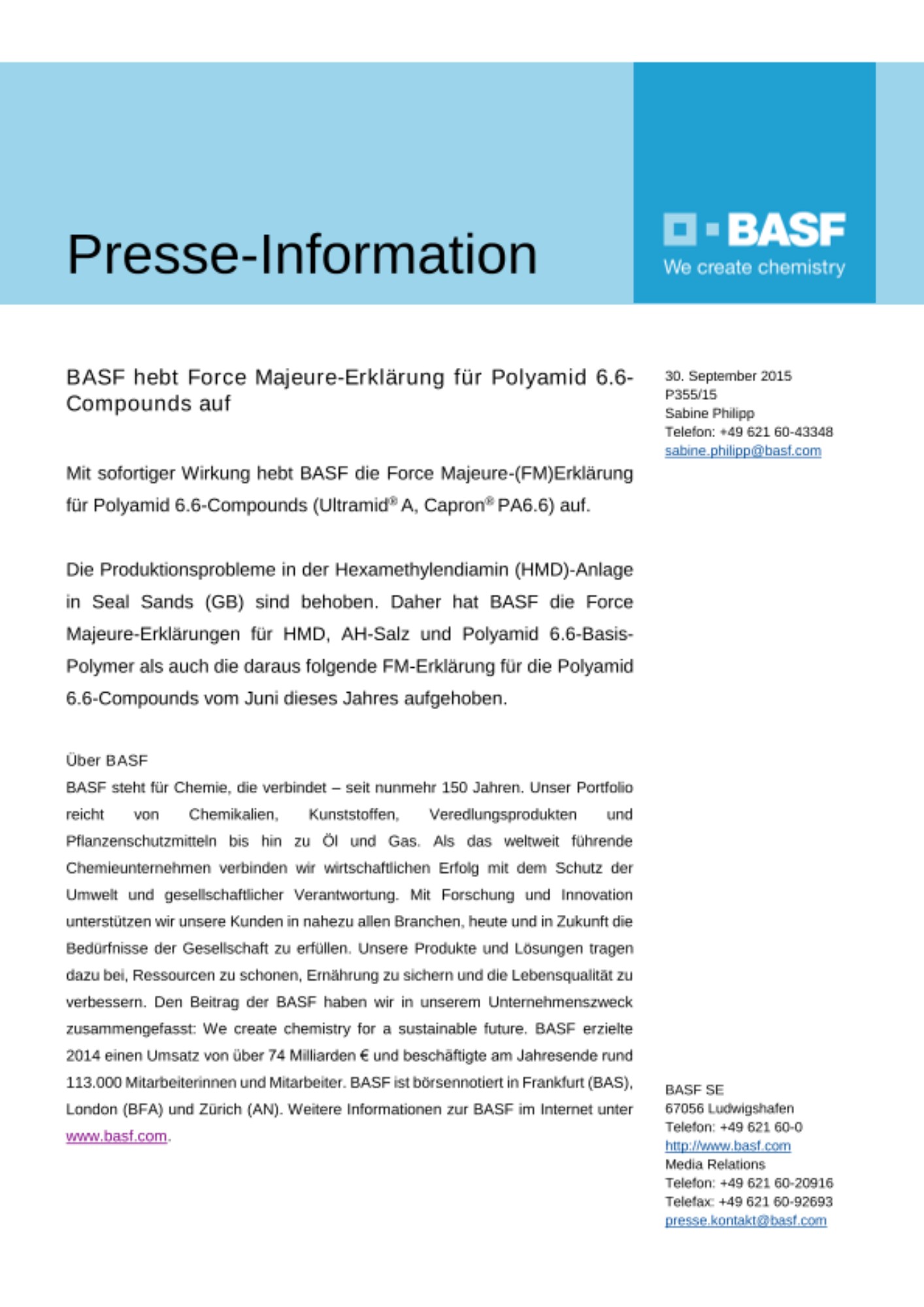 Die Produktionsprobleme in der Hexamethylendiamin (HMD)-Anlage in Seal Sands (GB) sind behoben. Daher hat BASF die Force Majeure-Erklärungen für HMD, AH-Salz und Polyamid 6.6-Basis-Polymer als auch die daraus folgende FM-Erklärung für die Polyamid 6.6-Compounds vom Juni dieses Jahres aufgehoben.