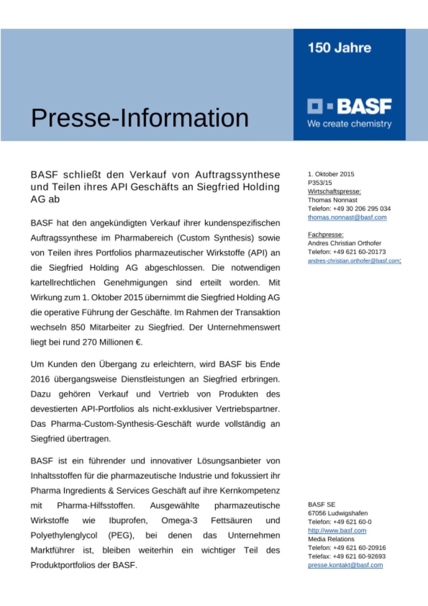 BASF hat den angekündigten Verkauf ihrer kundenspezifischen Auftragssynthese im Pharmabereich (Custom Synthesis) sowie von Teilen ihres Portfolios pharmazeutischer Wirkstoffe (API) an die Siegfried Holding AG abgeschlossen. Die notwendigen kartellrechtlichen Genehmigungen sind erteilt worden. Mit Wirkung zum 1. Oktober 2015 übernimmt die Siegfried Holding AG die operative Führung der Geschäfte. Im Rahmen der Transaktion wechseln 850 Mitarbeiter zu Siegfried. Der Unternehmenswert liegt bei rund 270 Millionen €.