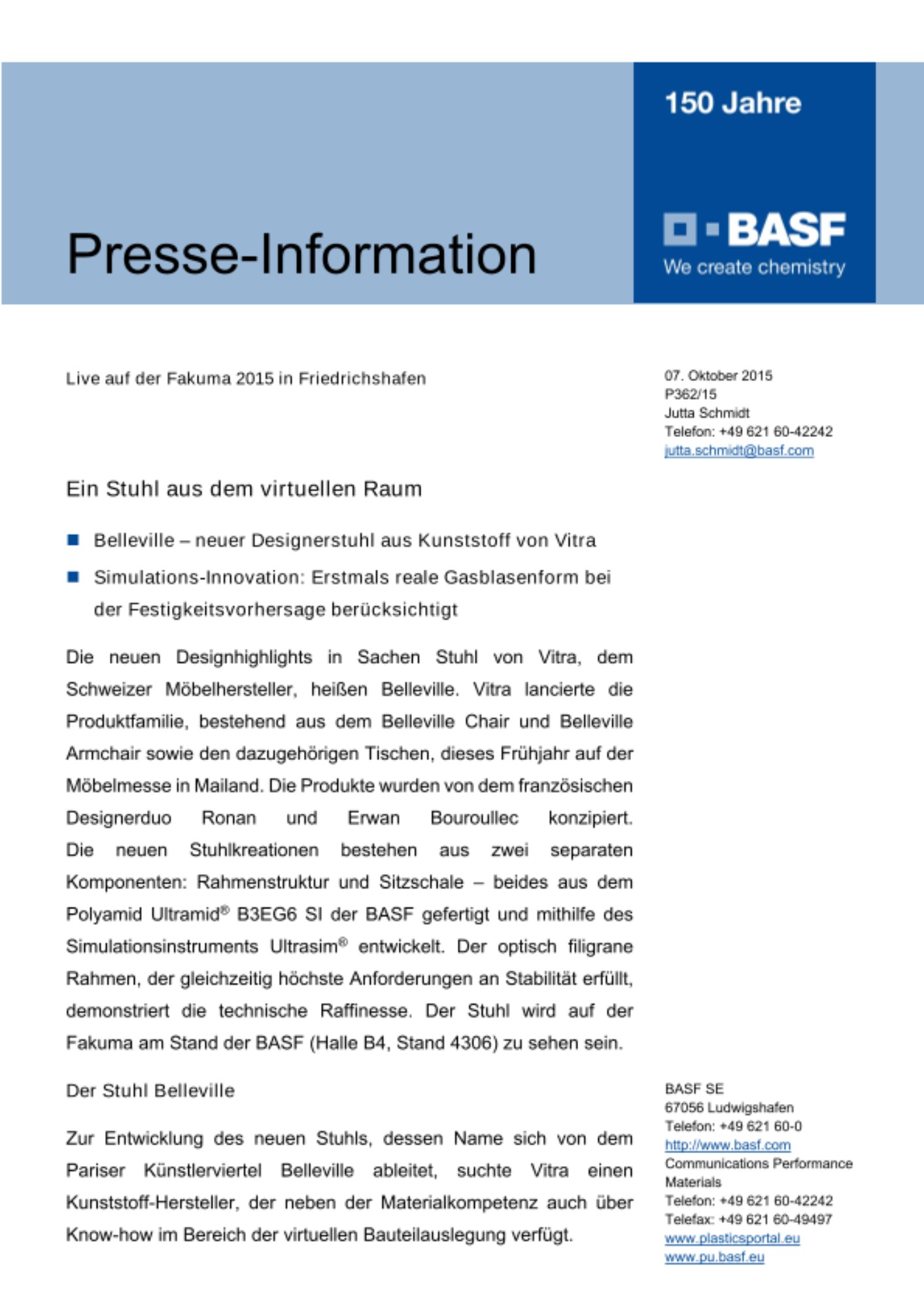 Der Bereich Performance Materials der BASF bündelt das gesamte werkstoffliche Know-how der BASF für innovative, maßgeschneiderte Kunststoffe unter einem Dach. Der Bereich, der in vier großen Branchen – Transportwesen, Bauwirtschaft, industrielle Anwendungen und Konsumgüter – aktiv ist, verfügt über ein breites Portfolio von Produkten und Services sowie ein tiefes Verständnis für anwendungsorientierte Systemlösungen. Wesentliche Treiber für Profitabilität und Wachstum sind unsere enge Zusammenarbeit mit den Kunden und ein klarer Fokus auf Lösungen. Starke F&E-Kompetenzen bilden die Basis für die Entwicklung innovativer Produkte und Anwendungen. 2014 betrug der weltweite Umsatz des Bereichs Performance Materials 6,5 Milliarden €. Mehr Informationen im Internet unter: www.performance-materials.basf.com.