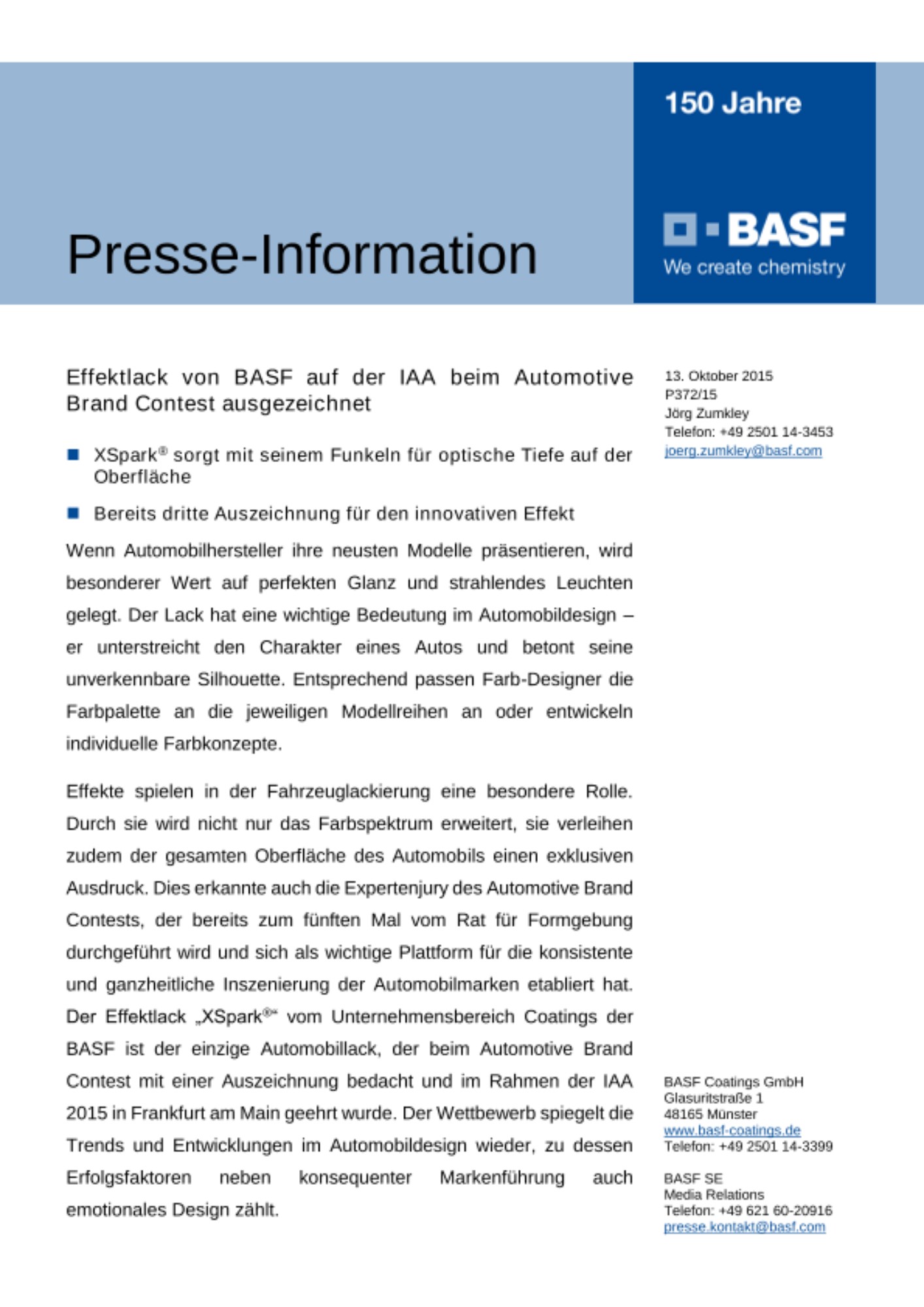 Effekte spielen in der Fahrzeuglackierung eine besondere Rolle. Durch sie wird nicht nur das Farbspektrum erweitert, sie verleihen zudem der gesamten Oberfläche des Automobils einen exklusiven Ausdruck. Dies erkannte auch die Expertenjury des Automotive Brand Contests, der bereits zum fünften Mal vom Rat für Formgebung durchgeführt wird und sich als wichtige Plattform für die konsistente und ganzheitliche Inszenierung der Automobilmarken etabliert hat. Der Effektlack „XSpark®“ vom Unternehmensbereich Coatings der BASF ist der einzige Automobillack, der beim Automotive Brand Contest mit einer Auszeichnung bedacht und im Rahmen der IAA 2015 in Frankfurt am Main geehrt wurde. Der Wettbewerb spiegelt die Trends und Entwicklungen im Automobildesign wieder, zu dessen Erfolgsfaktoren neben konsequenter Markenführung auch emotionales Design zählt.