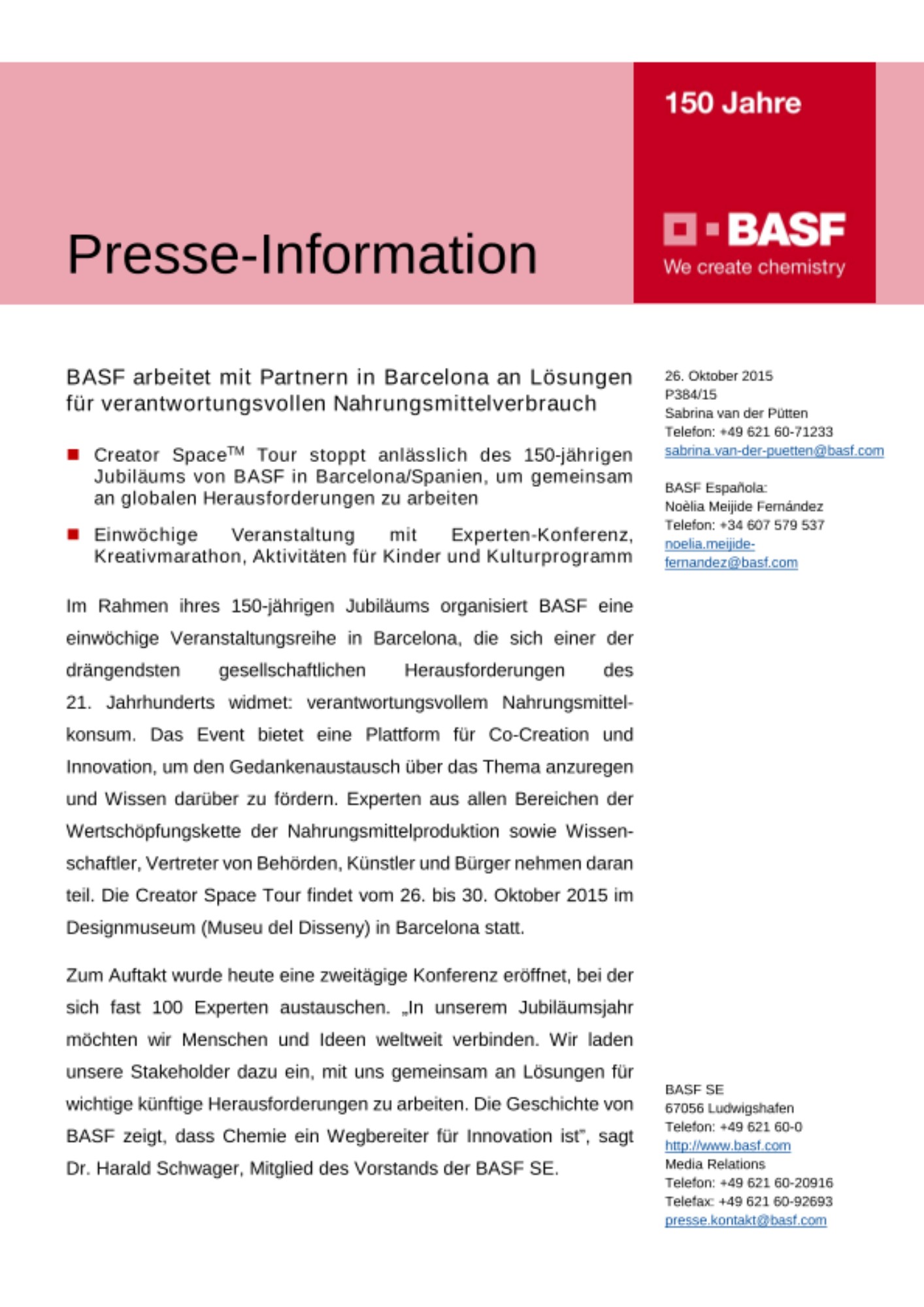 Im Rahmen ihres 150-jährigen Jubiläums organisiert BASF eine einwöchige Veranstaltungsreihe in Barcelona, die sich einer der drängendsten gesellschaftlichen Herausforderungen des 21. Jahrhunderts widmet: verantwortungsvollem Nahrungsmittelkonsum. Das Event bietet eine Plattform für Co-Creation und Innovation, um den Gedankenaustausch über das Thema anzuregen und Wissen darüber zu fördern. Experten aus allen Bereichen der Wertschöpfungskette der Nahrungsmittelproduktion sowie Wissenschaftler, Vertreter von Behörden, Künstler und Bürger nehmen daran teil. Die Creator Space Tour findet vom 26. bis 30. Oktober 2015 im Designmuseum (Museu del Disseny) in Barcelona statt.