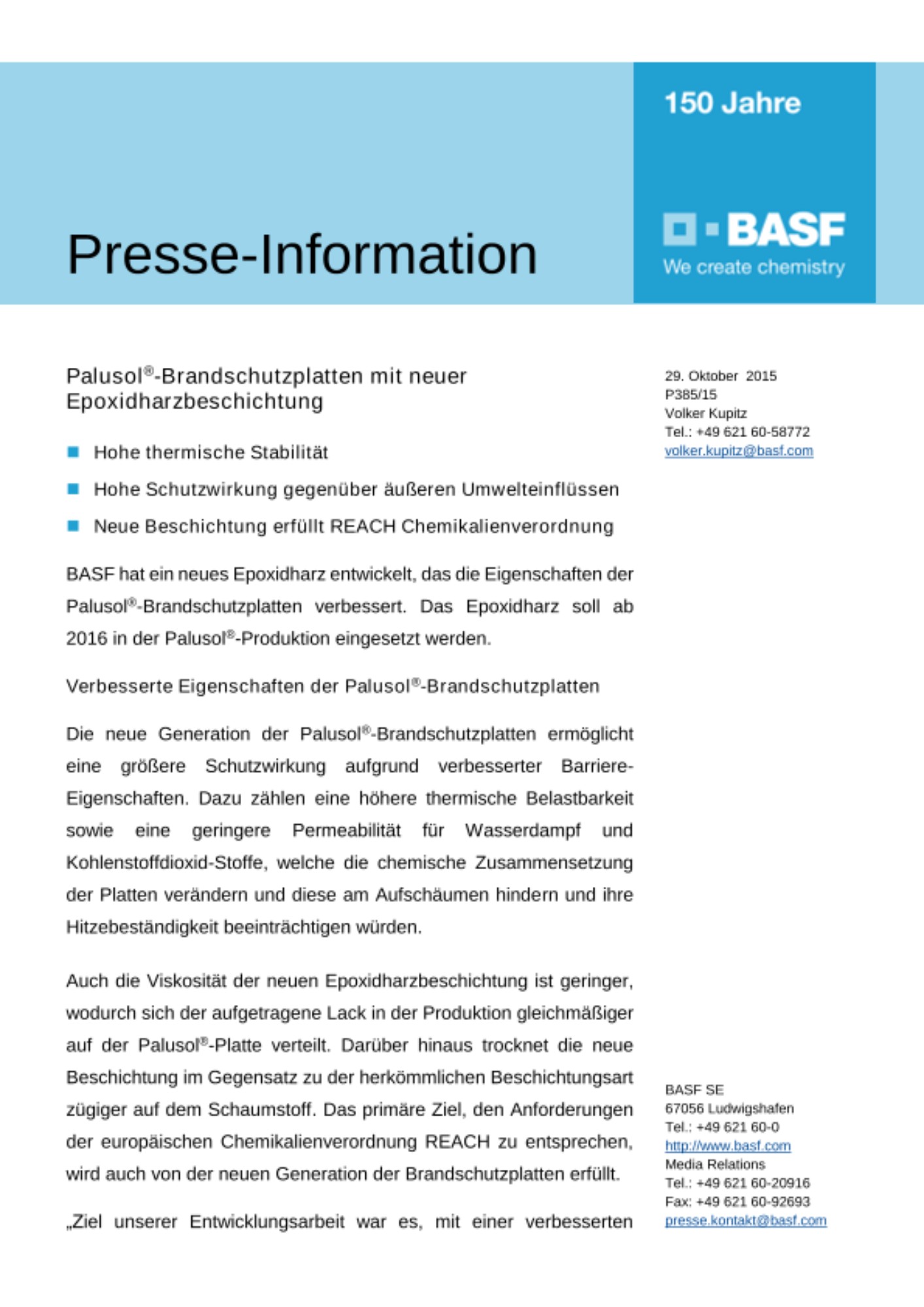 BASF hat ein neues Epoxidharz entwickelt, das die Eigenschaften der Palusol®-Brandschutzplatten verbessert. Das Epoxidharz soll ab 2016 in der Palusol®-Produktion eingesetzt werden.