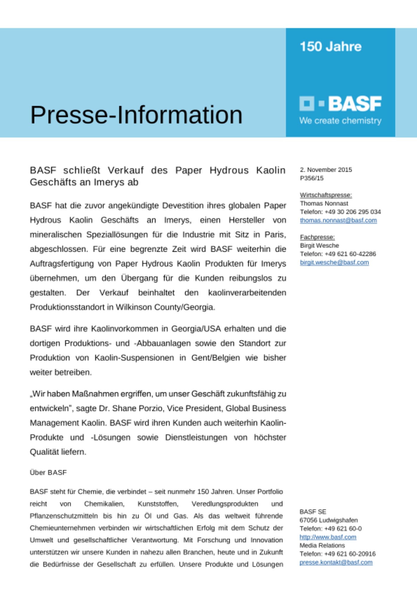 BASF hat die zuvor angekündigte Devestition ihres globalen Paper Hydrous Kaolin Geschäfts an Imerys, einen Hersteller von mineralischen Speziallösungen für die Industrie mit Sitz in Paris, abgeschlossen. Für eine begrenzte Zeit wird BASF weiterhin die Auftragsfertigung von Paper Hydrous Kaolin Produkten für Imerys übernehmen, um den Übergang für die Kunden reibungslos zu gestalten. Der Verkauf beinhaltet den kaolinverarbeitenden Produktionsstandort in Wilkinson County/Georgia.