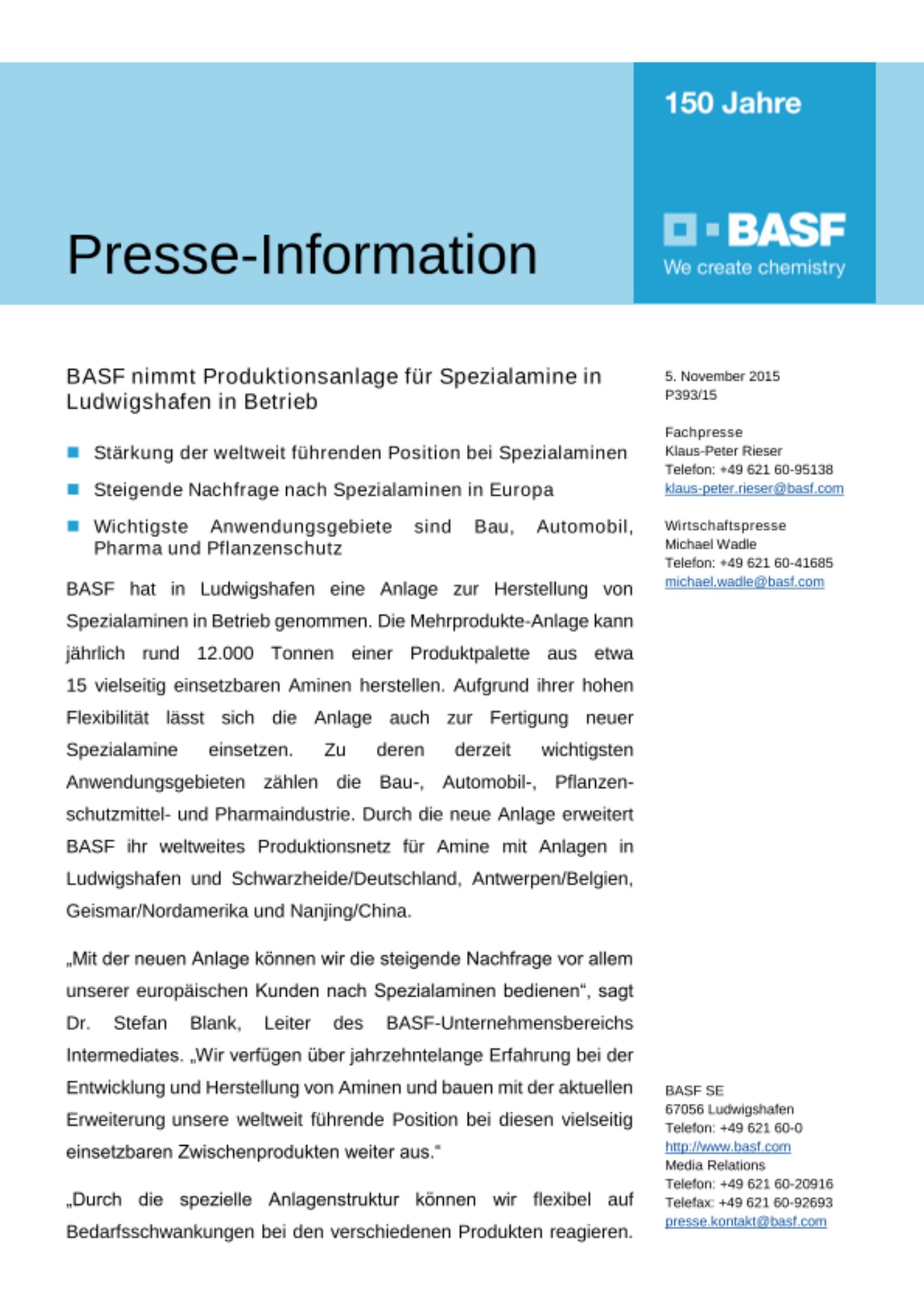 „Durch die spezielle Anlagenstruktur können wir flexibel auf Bedarfsschwankungen bei den verschiedenen Produkten reagieren. Außerdem können wir hier auch kommerzielle Mengen von Produkten aus unserer Innovationspipeline herstellen“, so Dr. Christoph Wegner, Leiter der regionalen Geschäftseinheit Amine Europa im BASF-Unternehmensbereich Intermediates, und ergänzt: „Durch die Integration in den BASF-Verbund am Standort Ludwigshafen können wir unseren Kunden neben der Forschung auch die Scale-Up-Leistungen über eine Pilotanlage bis hin zu der neuen Mehrprodukte-Anlage bieten.“