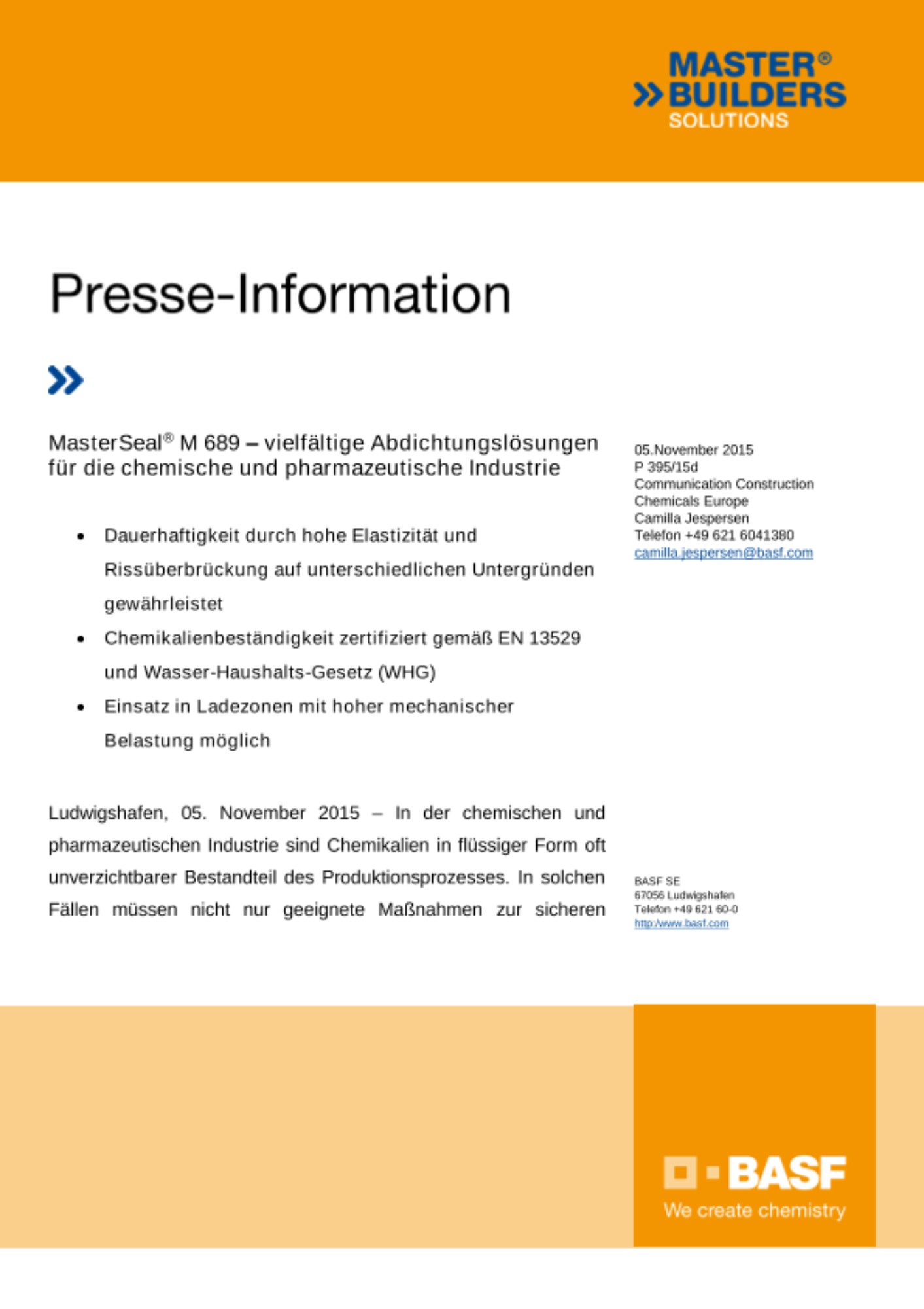 Ludwigshafen, 05. November 2015 – In der chemischen und pharmazeutischen Industrie sind Chemikalien in flüssiger Form oft unverzichtbarer Bestandteil des Produktionsprozesses. In solchen Fällen müssen nicht nur geeignete Maßnahmen zur sicheren Lagerung und Handhabung getroffen werden. Darüber hinaus fordert der Gesetzgeber auch sekundäre Rückhaltesysteme zum Schutz von Boden und Grundwasser vor Verunreinigungen bei unbeabsichtigtem Flüssigkeitsaustritt. Genau für diesen Einsatz in komplexen Industrieanlagen bietet BASF Abdichtungslösungen unter der Marke Master Builders Solutions an.