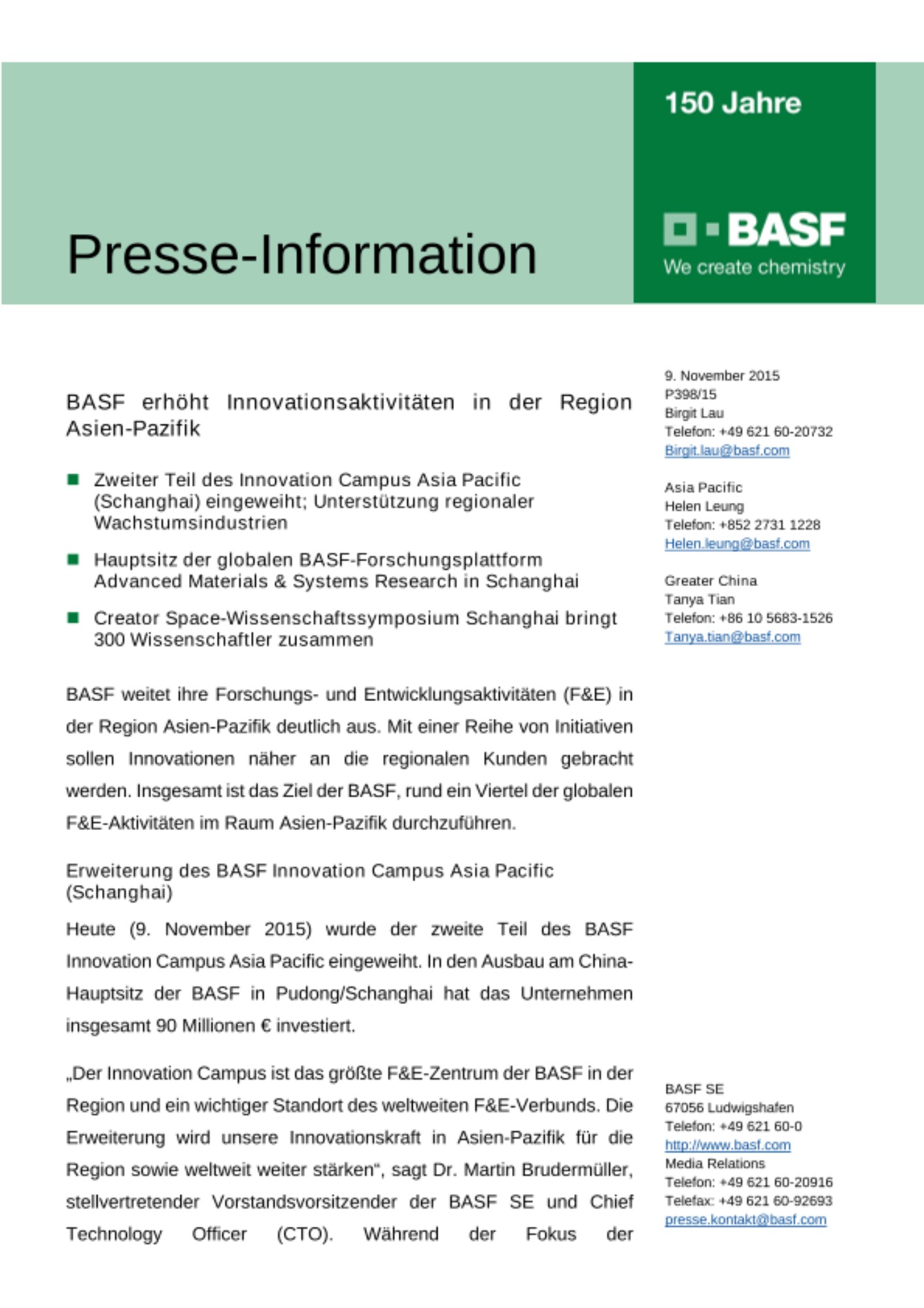 Innovationen sind ein wesentlicher Eckpfeiler der BASF „We create chemistry“-Strategie. Um im globalen Markt erfolgreich zu sein, ist es wichtig, eine starke Präsenz in den Schlüsselregionen zu haben. Um den Wirkungsgrad der BASF-Forschung in der Region Asien-Pazifik zu verstärken, wird der Hauptsitz des Bereichs Advanced Materials & Systems Research, einer der drei globalen Forschungsplattformen, ab dem 1. Januar 2016 auf dem Innovation Campus in Schanghai sein. Mit dem Umzug wird der Bereichsleiter, Dr. Harald Lauke, gleichzeitig die Verantwortung als Regional Research Representative der BASF für die Region Asien-Pazifik übernehmen.
