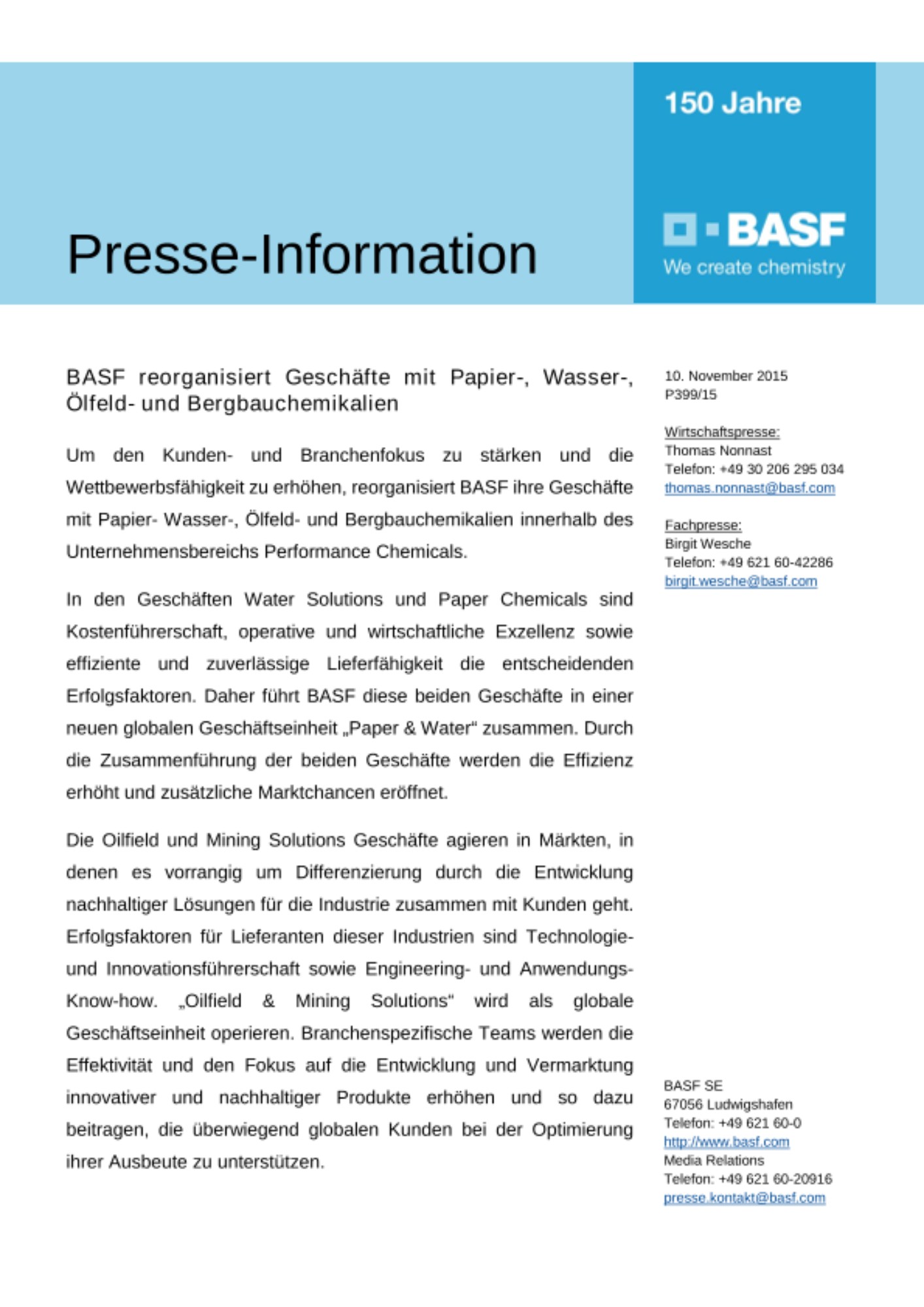 Um den Kunden- und Branchenfokus zu stärken und die Wettbewerbsfähigkeit zu erhöhen, reorganisiert BASF ihre Geschäfte mit Papier- Wasser-, Ölfeld- und Bergbauchemikalien innerhalb des Unternehmensbereichs Performance Chemicals.