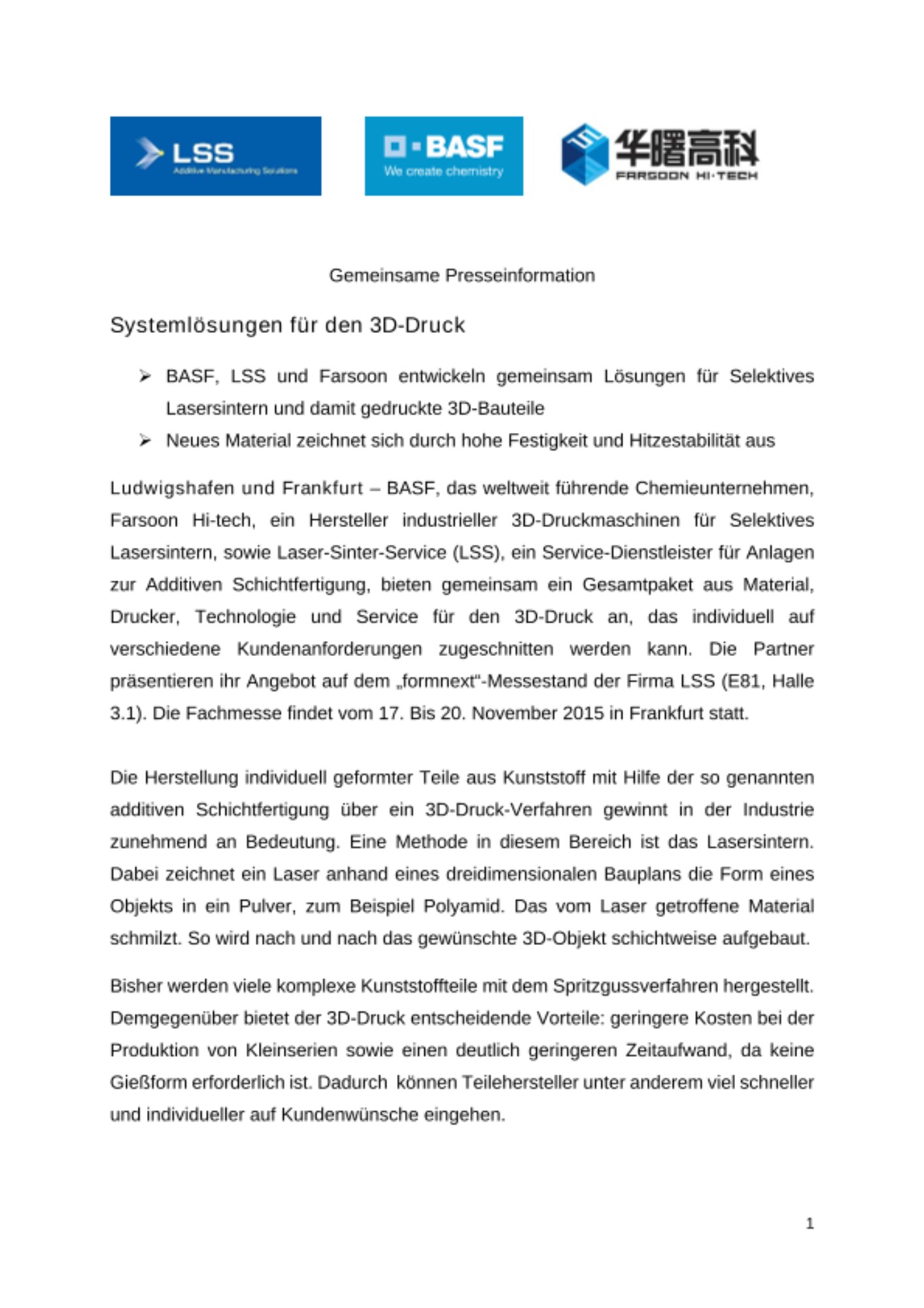 Ludwigshafen und Frankfurt – BASF, das weltweit führende Chemieunternehmen, Farsoon Hi-tech, ein Hersteller industrieller 3D-Druckmaschinen für Selektives Lasersintern, sowie Laser-Sinter-Service (LSS), ein Service-Dienstleister für Anlagen zur Additiven Schichtfertigung, bieten gemeinsam ein Gesamtpaket aus Material, Drucker, Technologie und Service für den 3D-Druck an, das individuell auf verschiedene Kundenanforderungen zugeschnitten werden kann. Die Partner präsentieren ihr Angebot auf dem „formnext“-Messestand der Firma LSS (E81, Halle 3.1). Die Fachmesse findet vom 17. Bis 20. November 2015 in Frankfurt statt.