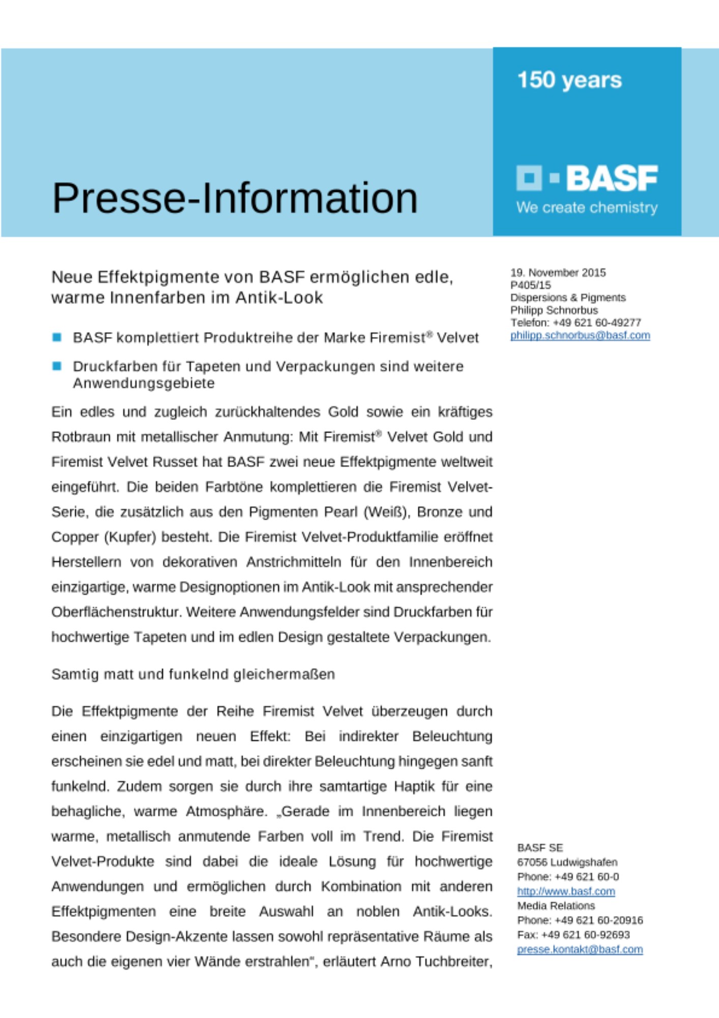 Die Effektpigmente der Reihe Firemist Velvet überzeugen durch einen einzigartigen neuen Effekt: Bei indirekter Beleuchtung erscheinen sie edel und matt, bei direkter Beleuchtung hingegen sanft funkelnd. Zudem sorgen sie durch ihre samtartige Haptik für eine behagliche, warme Atmosphäre. „Gerade im Innenbereich liegen warme, metallisch anmutende Farben voll im Trend. Die Firemist Velvet-Produkte sind dabei die ideale Lösung für hochwertige Anwendungen und ermöglichen durch Kombination mit anderen Effektpigmenten eine breite Auswahl an noblen Antik-Looks. Besondere Design-Akzente lassen sowohl repräsentative Räume als auch die eigenen vier Wände erstrahlen“, erläutert Arno Tuchbreiter, Leiter Marketing Pigmente für industrielle und dekorative Anwendungen bei BASF. Maler können Innenfarben auf Basis dieser Effektpigmente wie üblich direkt auf Beton-, Tapeten- und Holzflächen auftragen.