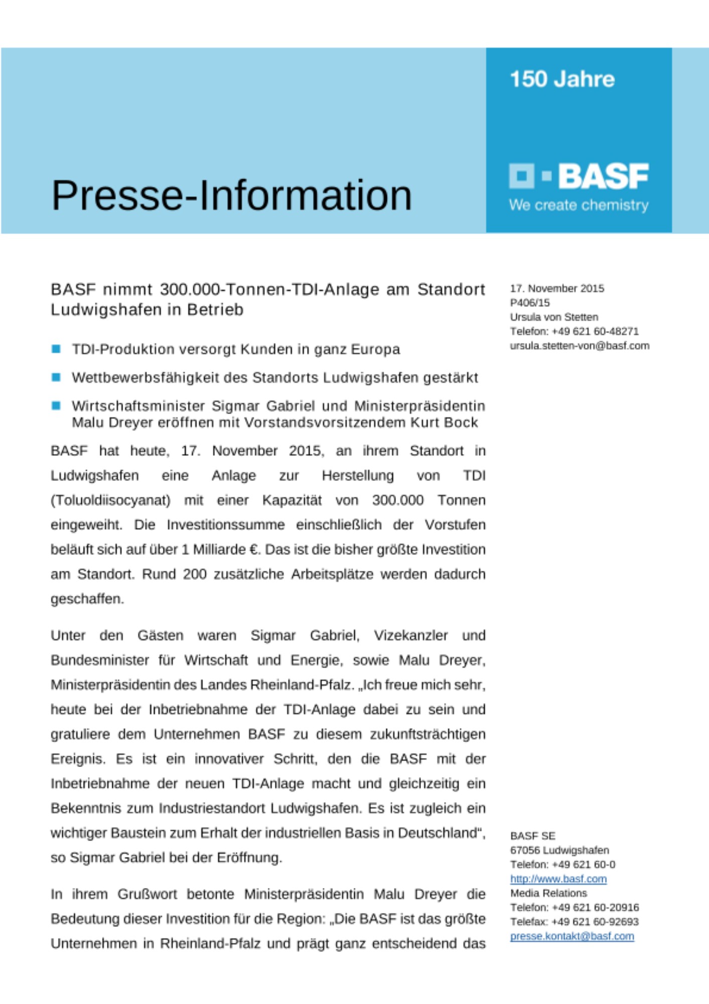 Unter den Gästen waren Sigmar Gabriel, Vizekanzler und Bundesminister für Wirtschaft und Energie, sowie Malu Dreyer, Ministerpräsidentin des Landes Rheinland-Pfalz. „Ich freue mich sehr, heute bei der Inbetriebnahme der TDI-Anlage dabei zu sein und gratuliere dem Unternehmen BASF zu diesem zukunftsträchtigen Ereignis. Es ist ein innovativer Schritt, den die BASF mit der Inbetriebnahme der neuen TDI-Anlage macht und gleichzeitig ein Bekenntnis zum Industriestandort Ludwigshafen. Es ist zugleich ein wichtiger Baustein zum Erhalt der industriellen Basis in Deutschland“, so Sigmar Gabriel bei der Eröffnung.