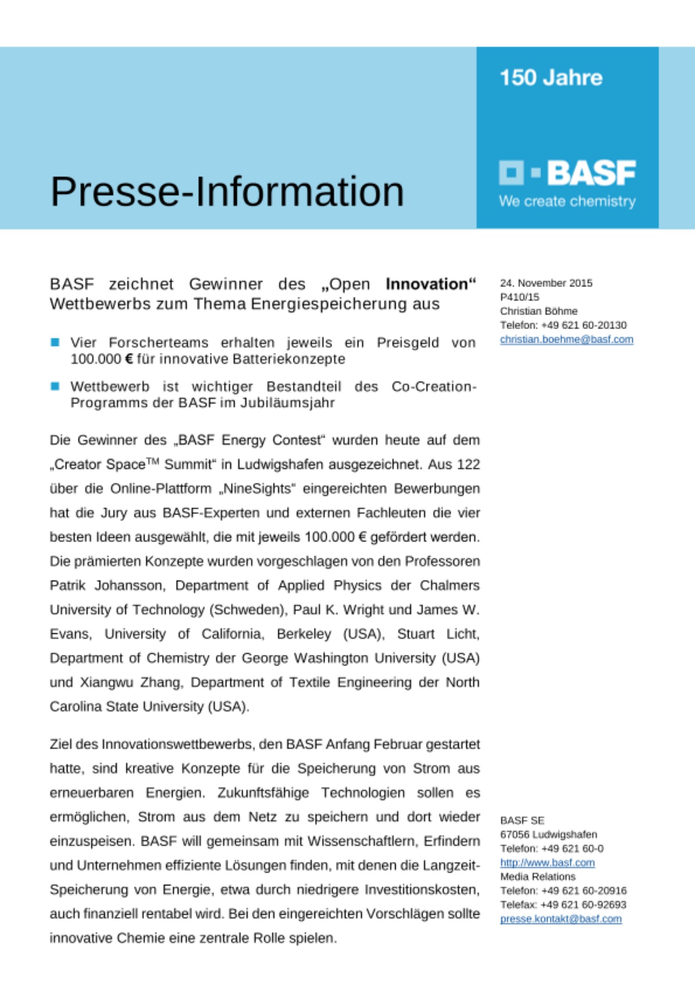 Mit dem Ziel, neue Ideen zu finden und Kontakte zu knüpfen, ist der Wettbewerb ein wichtiger Bestandteil des Co-Creation-Programms der BASF anlässlich ihres 150. Jubiläums. Dieses Programm unter dem Namen Creator SpaceTM bietet innovative Formate für den virtuellen und persönlichen Austausch und umfasste außerdem drei hochkarätige Wissenschaftssymposien. Auf diesen Wegen sollen neue Ideen gesammelt und die Diskussion zu den Themen Energie, Ernährung und städtisches Leben gefördert werden. BASF will Menschen und Ideen zusammenbringen, um an Lösungen für drängende gesellschaftliche Herausforderungen zu arbeiten. Der Innovationswettbewerb zum Thema Energiespeicherung wurde vom BASF-Forschungsbereich „Process Research and Chemical Engineering“ koordiniert.