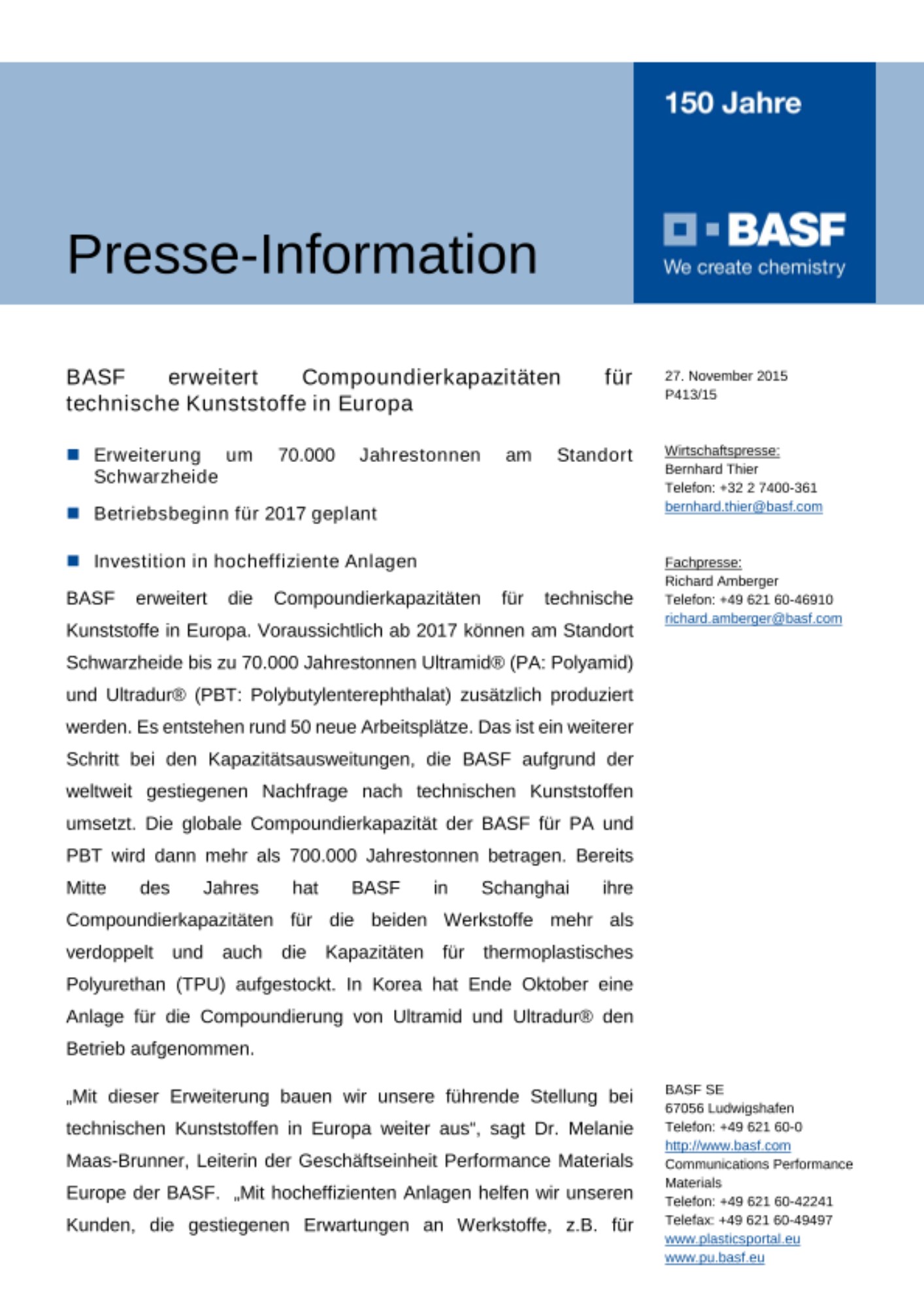 BASF erweitert die Compoundierkapazitäten für technische Kunststoffe in Europa. Voraussichtlich ab 2017 können am Standort Schwarzheide bis zu 70.000 Jahrestonnen Ultramid® (PA: Polyamid) und Ultradur® (PBT: Polybutylenterephthalat) zusätzlich produziert werden. Es entstehen rund 50 neue Arbeitsplätze. Das ist ein weiterer Schritt bei den Kapazitätsausweitungen, die BASF aufgrund der weltweit gestiegenen Nachfrage nach technischen Kunststoffen umsetzt. Die globale Compoundierkapazität der BASF für PA und PBT wird dann mehr als 700.000 Jahrestonnen betragen. Bereits Mitte des Jahres hat BASF in Schanghai ihre Compoundierkapazitäten für die beiden Werkstoffe mehr als verdoppelt und auch die Kapazitäten für thermoplastisches Polyurethan (TPU) aufgestockt. In Korea hat Ende Oktober eine Anlage für die Compoundierung von Ultramid und Ultradur® den Betrieb aufgenommen.