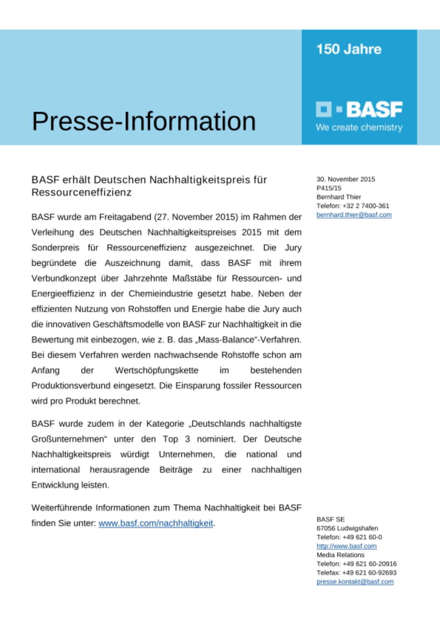 BASF wurde am Freitagabend (27. November 2015) im Rahmen der Verleihung des Deutschen Nachhaltigkeitspreises 2015 mit dem Sonderpreis für Ressourceneffizienz ausgezeichnet. Die Jury begründete die Auszeichnung damit, dass BASF mit ihrem Verbundkonzept über Jahrzehnte Maßstäbe für Ressourcen- und Energieeffizienz in der Chemieindustrie gesetzt habe. Neben der effizienten Nutzung von Rohstoffen und Energie habe die Jury auch die innovativen Geschäftsmodelle von BASF zur Nachhaltigkeit in die Bewertung mit einbezogen, wie z. B. das „Mass-Balance“-Verfahren. Bei diesem Verfahren werden nachwachsende Rohstoffe schon am Anfang der Wertschöpfungskette im bestehenden Produktionsverbund eingesetzt. Die Einsparung fossiler Ressourcen wird pro Produkt berechnet.