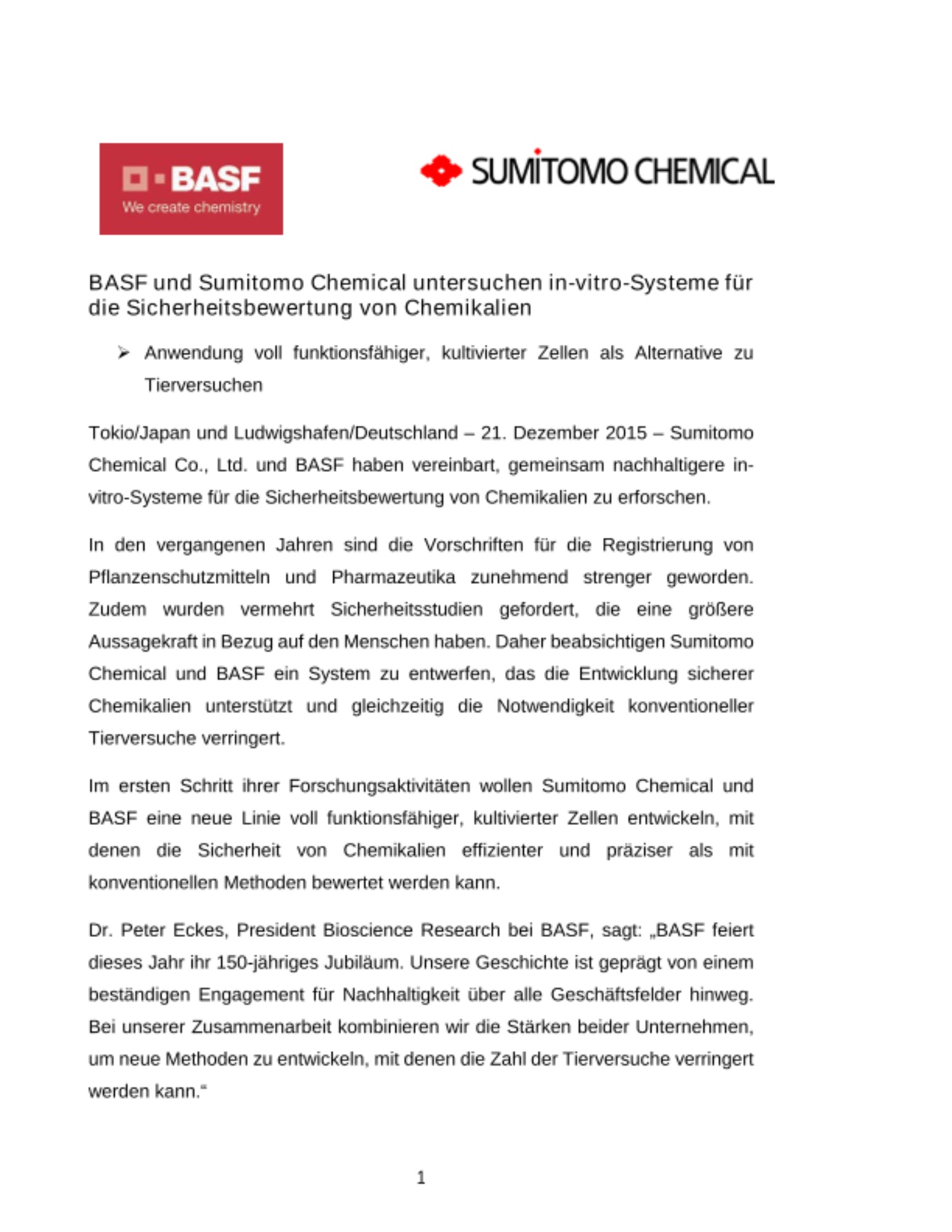 Tokio/Japan und Ludwigshafen/Deutschland – 21. Dezember 2015 – Sumitomo Chemical Co., Ltd. und BASF haben vereinbart, gemeinsam nachhaltigere in-vitro-Systeme für die Sicherheitsbewertung von Chemikalien zu erforschen.