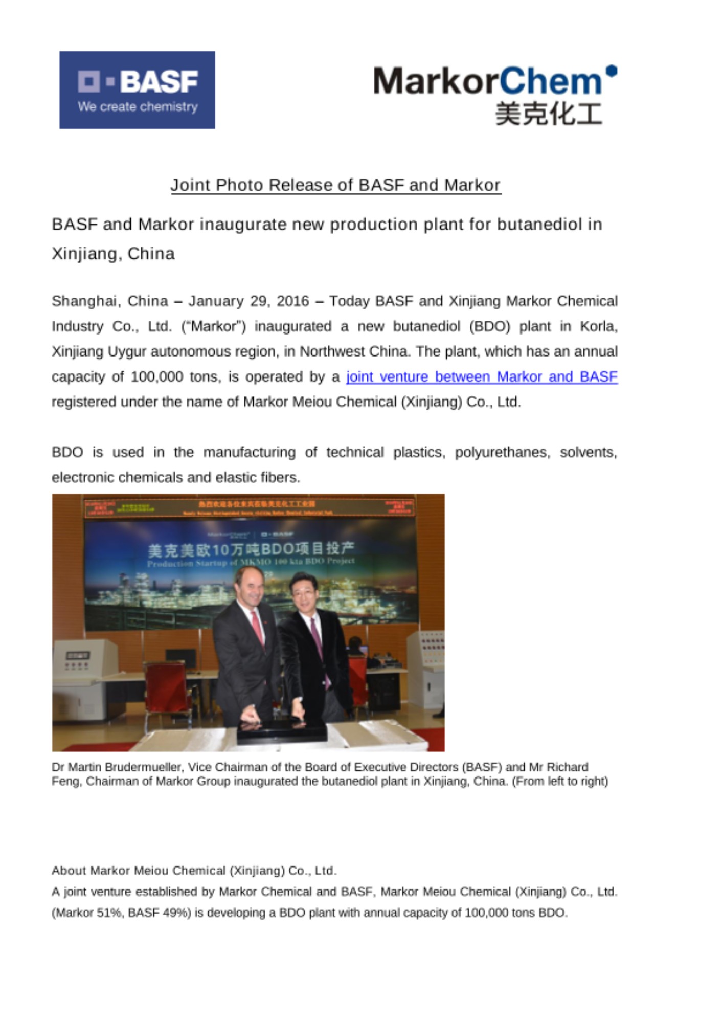Shanghai, China – January 29, 2016 – Today BASF and Xinjiang Markor Chemical Industry Co., Ltd. (“Markor”) inaugurated a new butanediol (BDO) plant in Korla, Xinjiang Uygur autonomous region, in Northwest China. The plant, which has an annual capacity of 100,000 tons, is operated by a joint venture between Markor and BASF registered under the name of Markor Meiou Chemical (Xinjiang) Co., Ltd.