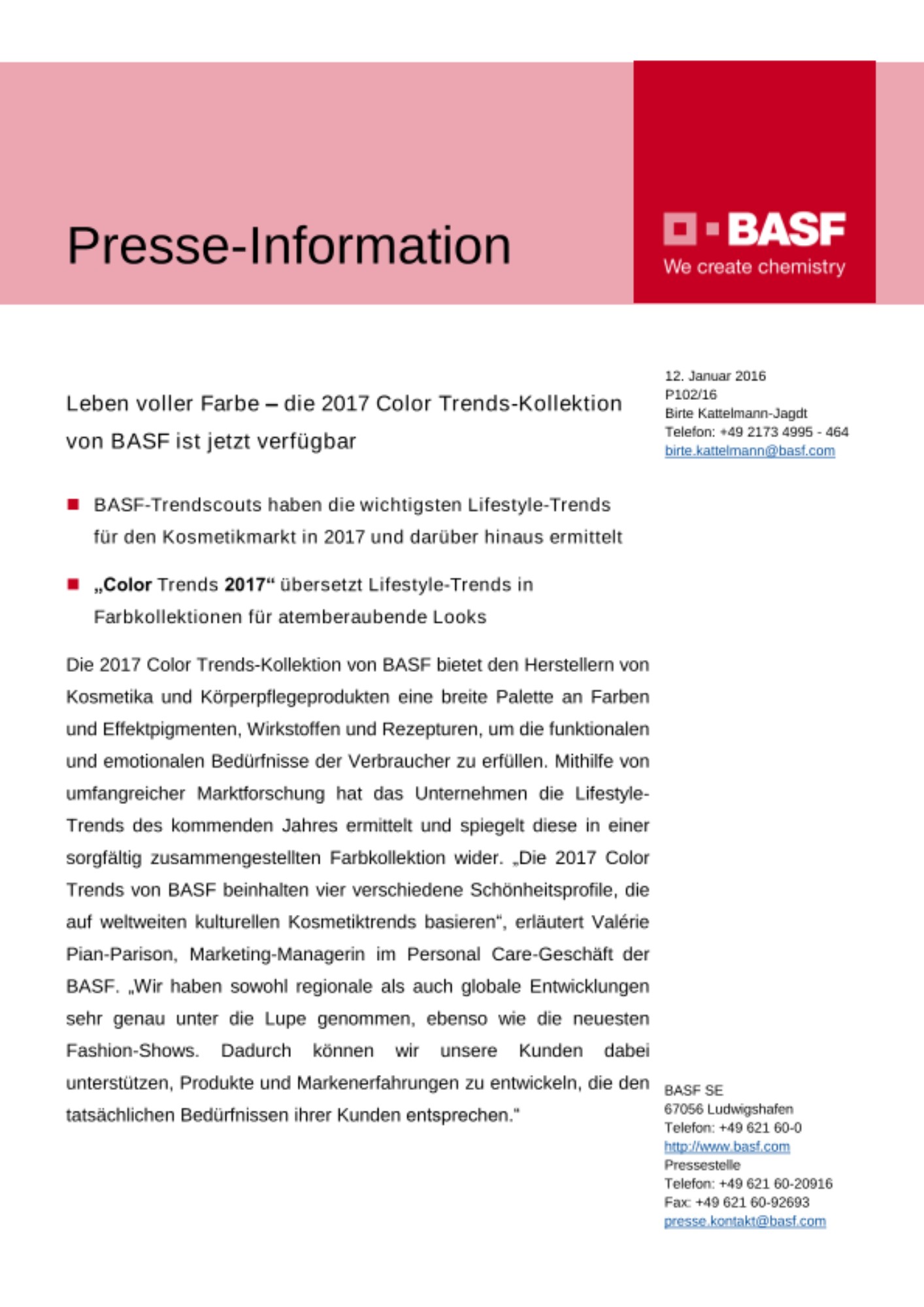Die 2017 Color Trends-Kollektion von BASF bietet den Herstellern von Kosmetika und Körperpflegeprodukten eine breite Palette an Farben und Effektpigmenten, Wirkstoffen und Rezepturen, um die funktionalen und emotionalen Bedürfnisse der Verbraucher zu erfüllen. Mithilfe von umfangreicher Marktforschung hat das Unternehmen die Lifestyle-Trends des kommenden Jahres ermittelt und spiegelt diese in einer sorgfältig zusammengestellten Farbkollektion wider. „Die 2017 Color Trends von BASF beinhalten vier verschiedene Schönheitsprofile, die auf weltweiten kulturellen Kosmetiktrends basieren“, erläutert Valérie Pian-Parison, Marketing-Managerin im Personal Care-Geschäft der BASF. „Wir haben sowohl regionale als auch globale Entwicklungen sehr genau unter die Lupe genommen, ebenso wie die neuesten Fashion-Shows. Dadurch können wir unsere Kunden dabei unterstützen, Produkte und Markenerfahrungen zu entwickeln, die den tatsächlichen Bedürfnissen ihrer Kunden entsprechen.“