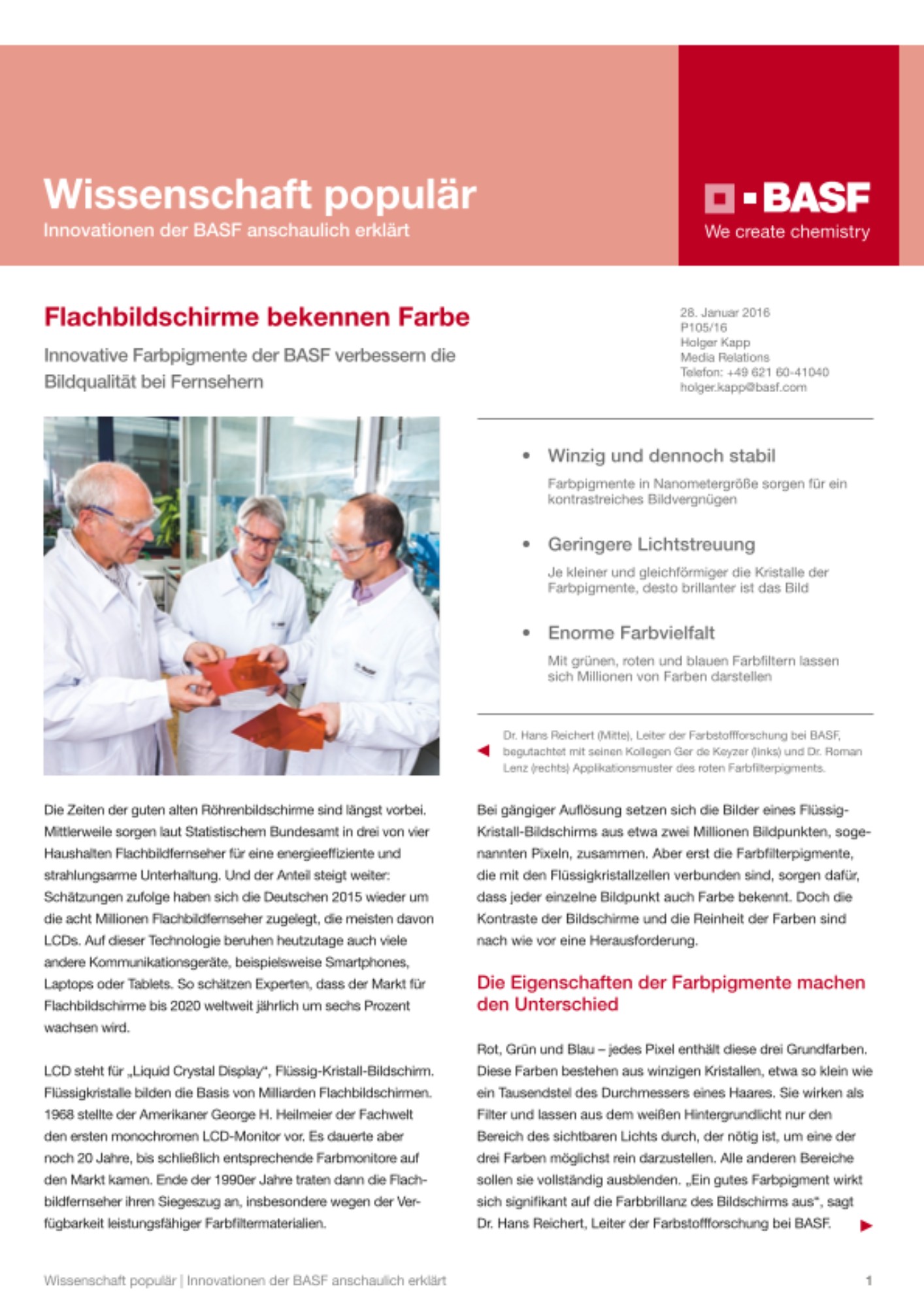Rot, Grün und Blau – jedes Pixel enthält diese drei Grundfarben. Diese Farben bestehen aus winzigen Kristallen, etwa so klein wie ein Tausendstel des Durchmessers eines Haares. Sie wirken als Filter und lassen aus dem weißen Hintergrundlicht nur den Bereich des sichtbaren Lichts durch, der nötig ist, um eine der drei Farben möglichst rein darzustellen. Alle anderen Bereiche sollen sie vollständig ausblenden. „Ein gutes Farbpigment wirkt sich signifikant auf die Farbbrillanz des Bildschirms aus“, sagt Dr. Hans Reichert, Leiter der Farbstoffforschung bei BASF. „Eine perfekte Farbselektion ist mit absorbierenden Materialien zwar nicht möglich, aber wir kommen dem Ideal mit unseren Rotfiltern schon recht nah.“ Das wirkt sich auch auf die Zahl der Farbvarianten aus: Je reiner die resultierenden drei Grundfarben sind, umso vielfältiger deren Mischmöglichkeiten – und desto farbprächtiger das wiedergegebene Bild.