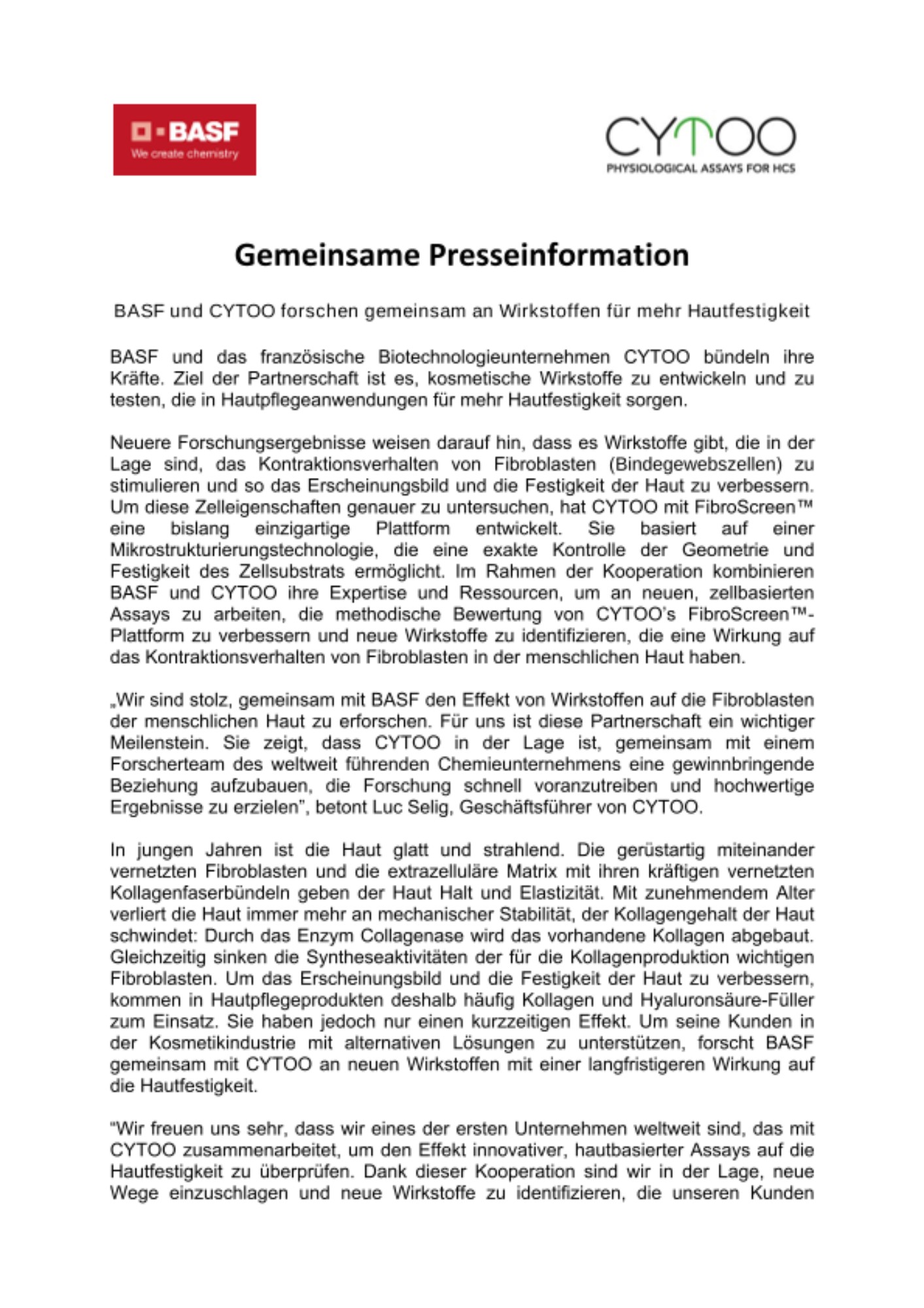„Wir sind stolz, gemeinsam mit BASF den Effekt von Wirkstoffen auf die Fibroblasten der menschlichen Haut zu erforschen. Für uns ist diese Partnerschaft ein wichtiger Meilenstein. Sie zeigt, dass CYTOO in der Lage ist, gemeinsam mit einem Forscherteam des weltweit führenden Chemieunternehmens eine gewinnbringende Beziehung aufzubauen, die Forschung schnell voranzutreiben und hochwertige Ergebnisse zu erzielen”, betont Luc Selig, Geschäftsführer von CYTOO.