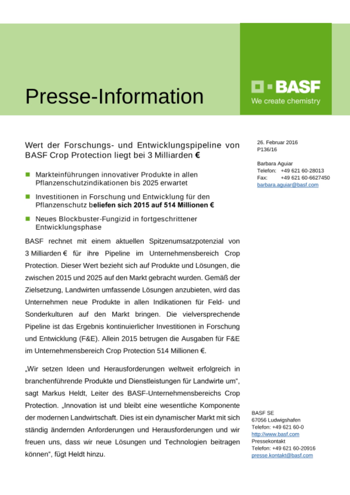 „Wir setzen Ideen und Herausforderungen weltweit erfolgreich in branchenführende Produkte und Dienstleistungen für Landwirte um“, sagt Markus Heldt, Leiter des BASF-Unternehmensbereichs Crop Protection. „Innovation ist und bleibt eine wesentliche Komponente der modernen Landwirtschaft. Dies ist ein dynamischer Markt mit sich ständig ändernden Anforderungen und Herausforderungen und wir freuen uns, dass wir neue Lösungen und Technologien beitragen können“, fügt Heldt hinzu.