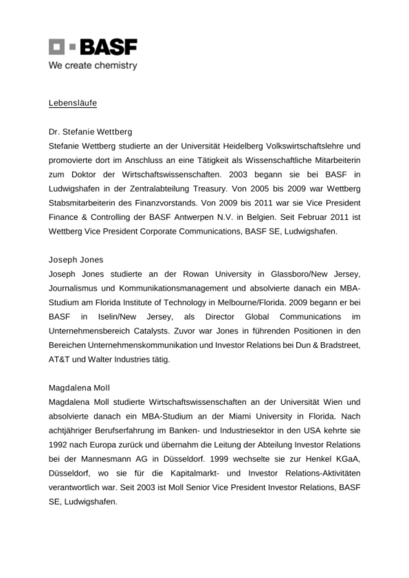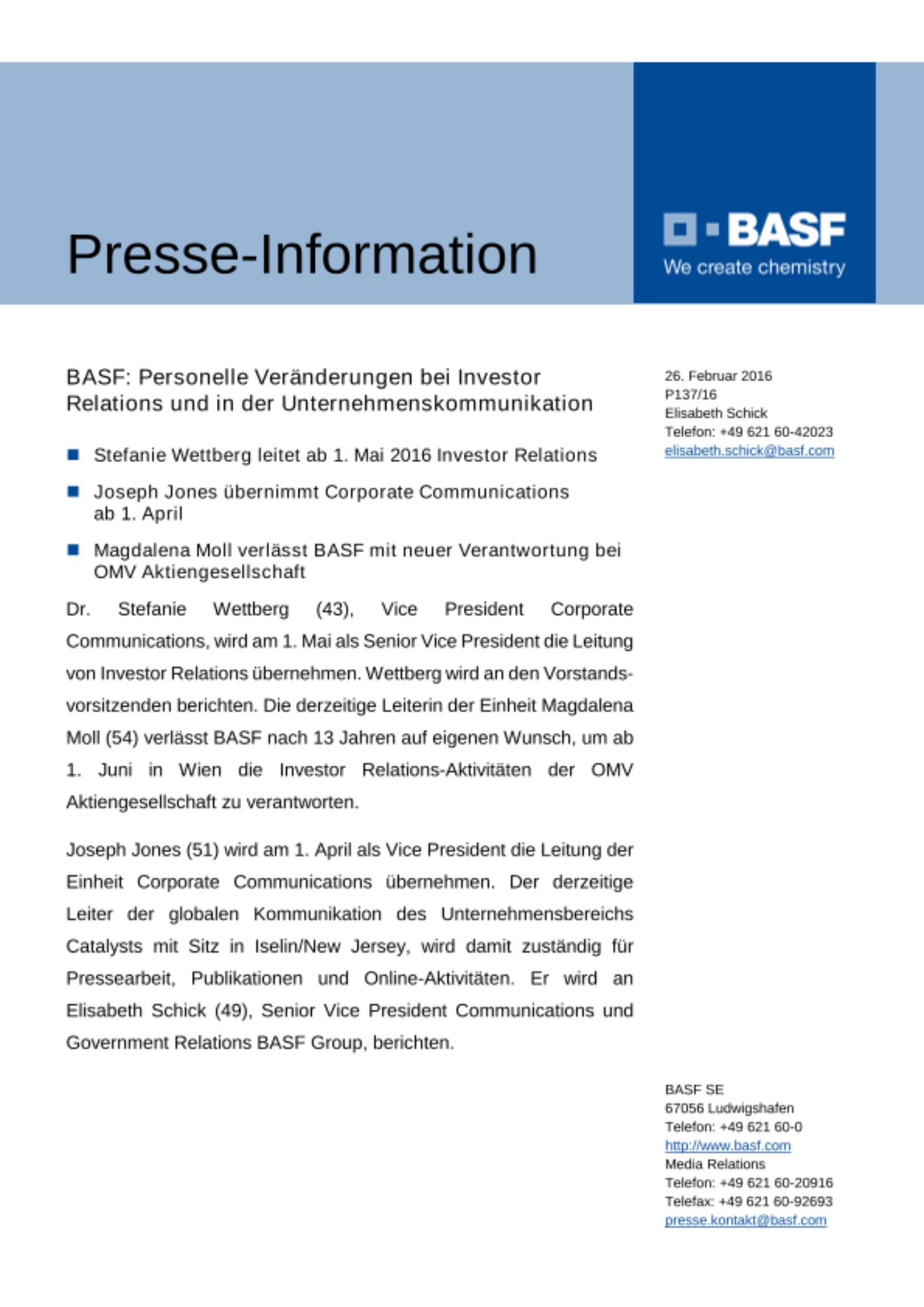 Dr. Stefanie Wettberg (43), Vice President Corporate Communications, wird am 1. Mai als Senior Vice President die Leitung von Investor Relations übernehmen. Wettberg wird an den Vorstandsvorsitzenden berichten. Die derzeitige Leiterin der Einheit Magdalena Moll (54) verlässt BASF nach 13 Jahren auf eigenen Wunsch, um ab 1. Juni in Wien die Investor Relations-Aktivitäten der OMV Aktiengesellschaft zu verantworten.