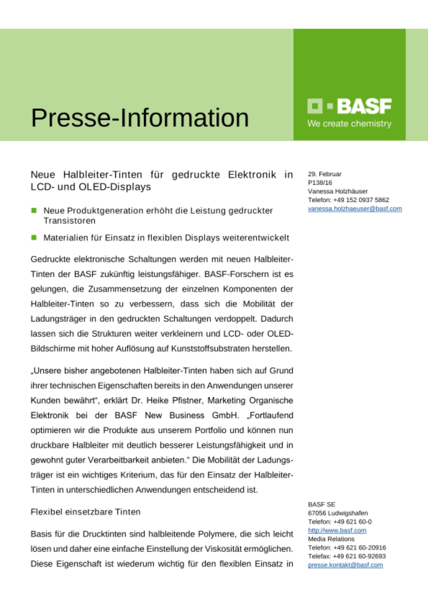 Gedruckte elektronische Schaltungen werden mit neuen Halbleiter-Tinten der BASF zukünftig leistungsfähiger. BASF-Forschern ist es gelungen, die Zusammensetzung der einzelnen Komponenten der Halbleiter-Tinten so zu verbessern, dass sich die Mobilität der Ladungsträger in den gedruckten Schaltungen verdoppelt. Dadurch lassen sich die Strukturen weiter verkleinern und LCD- oder OLED-Bildschirme mit hoher Auflösung auf Kunststoffsubstraten herstellen.