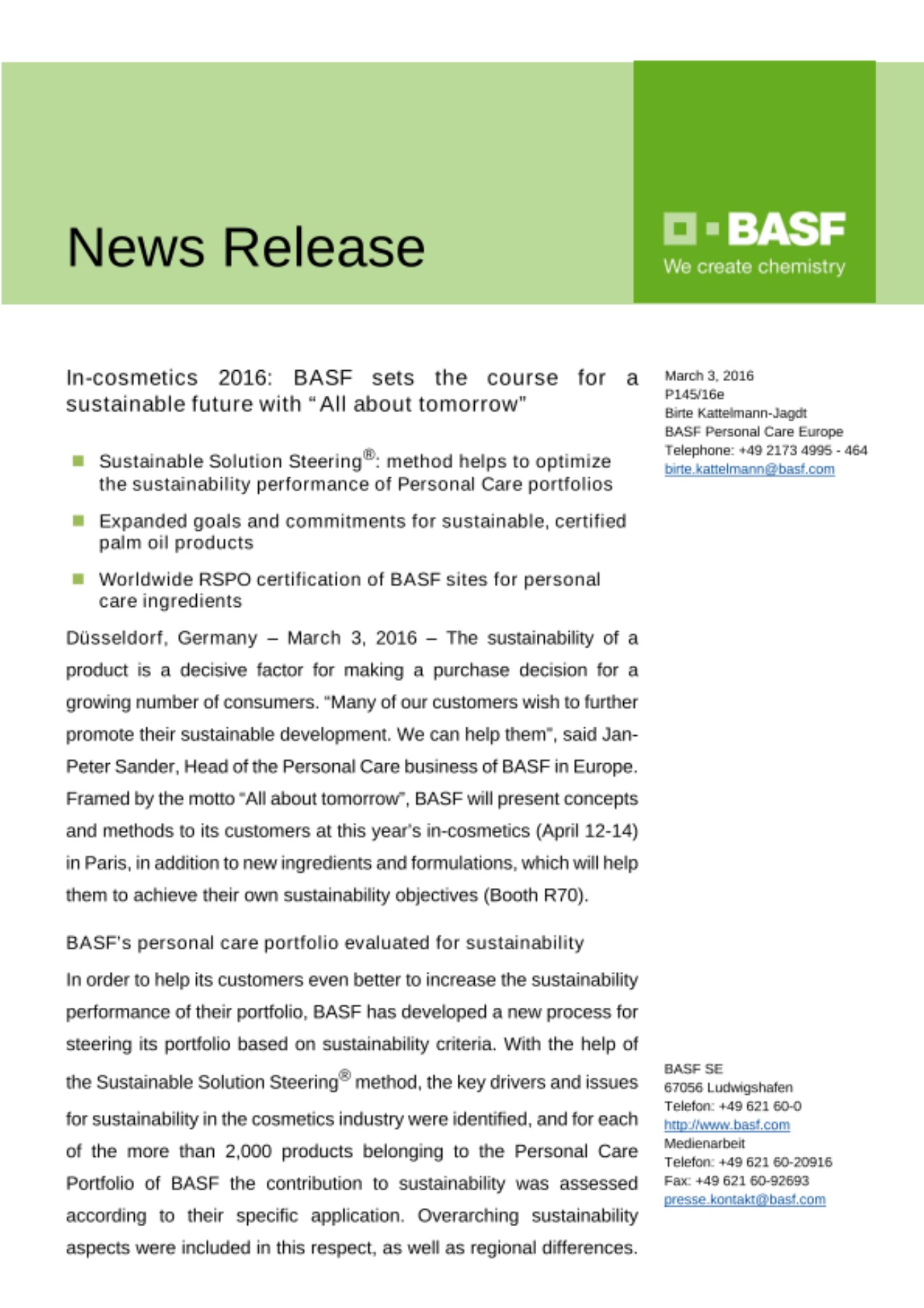 Für eine wachsende Zahl von Verbrauchern ist die Nachhaltigkeit eines Produkts ein entscheidender Faktor bei der Kaufentscheidung. „Viele unserer Kunden wollen ihre nachhaltige Entwicklung weiter vorantreiben. Wir können ihnen dabei helfen“, sagt der Leiter des Personal Care-Geschäfts der BASF in Europa, Jan-Peter Sander. Unter dem Titel „All about tomorrow“ wird BASF ihren Kunden auf der diesjährigen in-cosmetics (12.-14. April) in Paris neben neuen Inhaltsstoffen und Formulierungen, Konzepte und Methoden präsentieren, die ihnen helfen, ihre eigenen Nachhaltigkeitsziele zu erreichen (Stand R70).