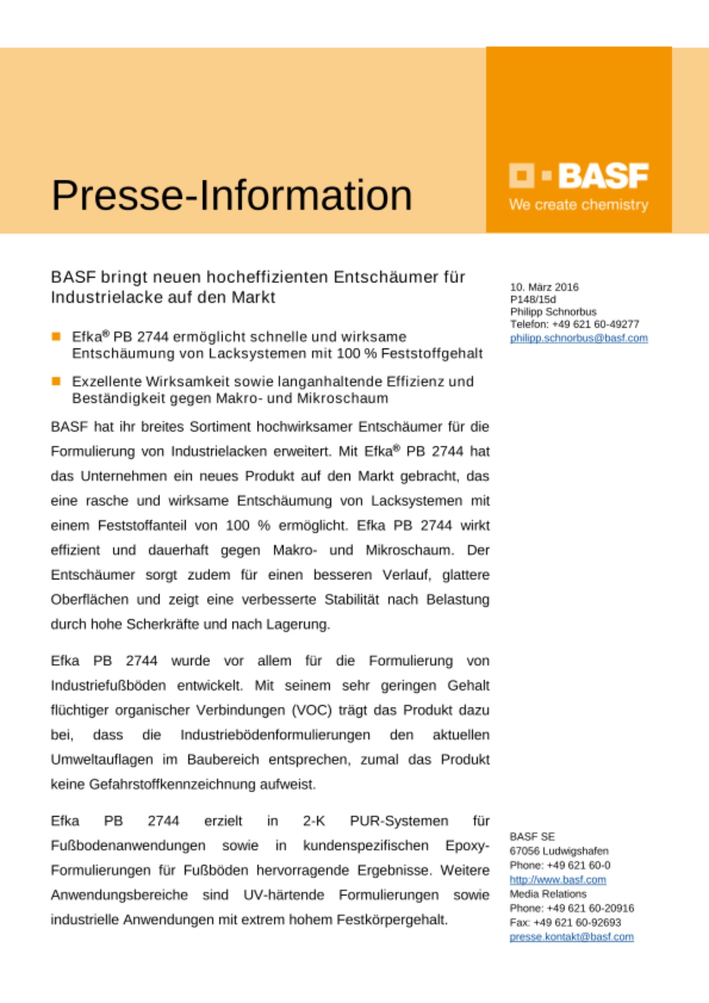 - Efka® PB 2744 ermöglicht schnelle und wirksame Entschäumung von Lacksystemen mit 100 % Feststoffgehalt