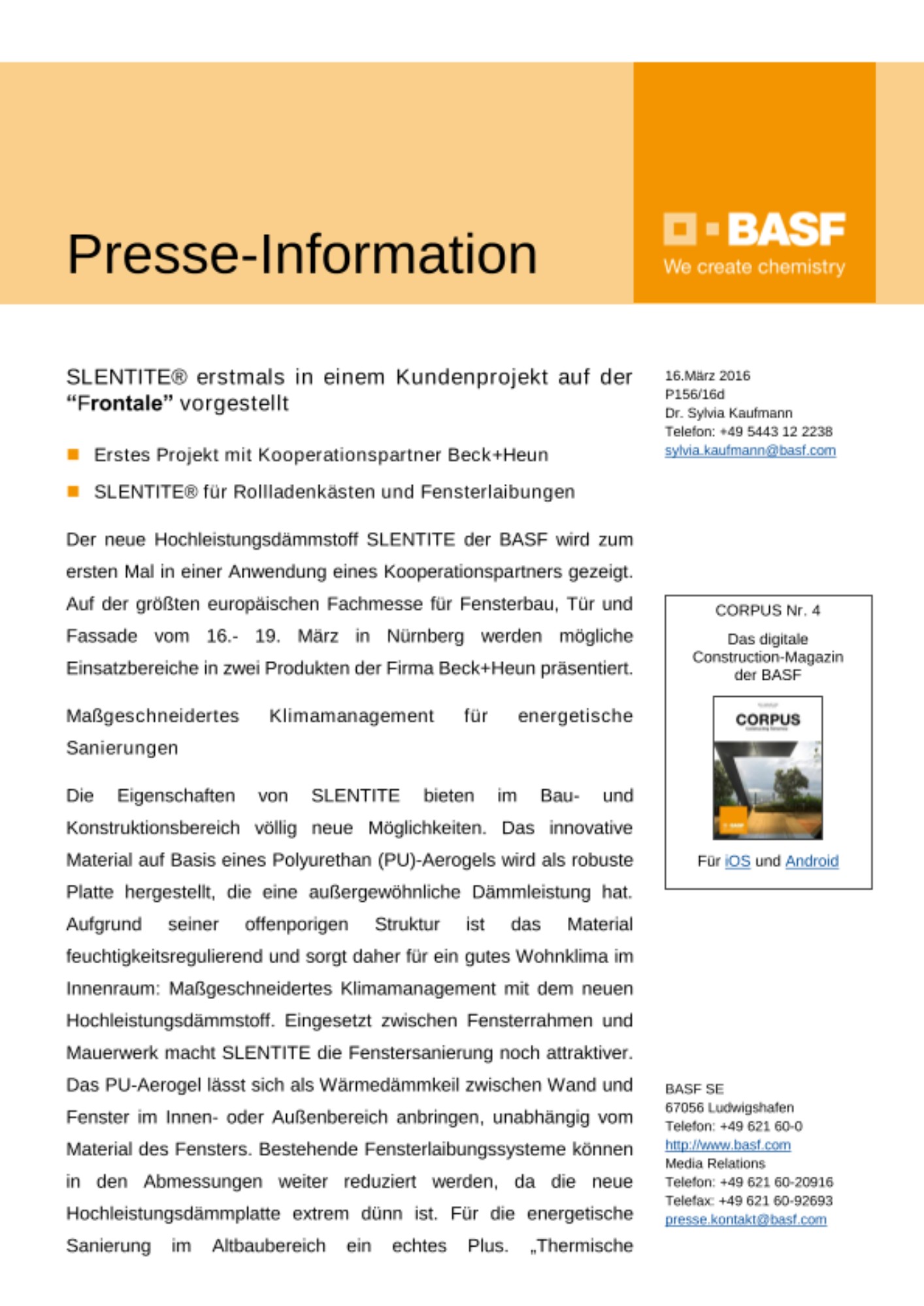 Der neue Hochleistungsdämmstoff SLENTITE der BASF wird zum ersten Mal in einer Anwendung eines Kooperationspartners gezeigt. Auf der größten europäischen Fachmesse für Fensterbau, Tür und Fassade vom 16.- 19. März in Nürnberg werden mögliche Einsatzbereiche in zwei Produkten der Firma Beck+Heun präsentiert.