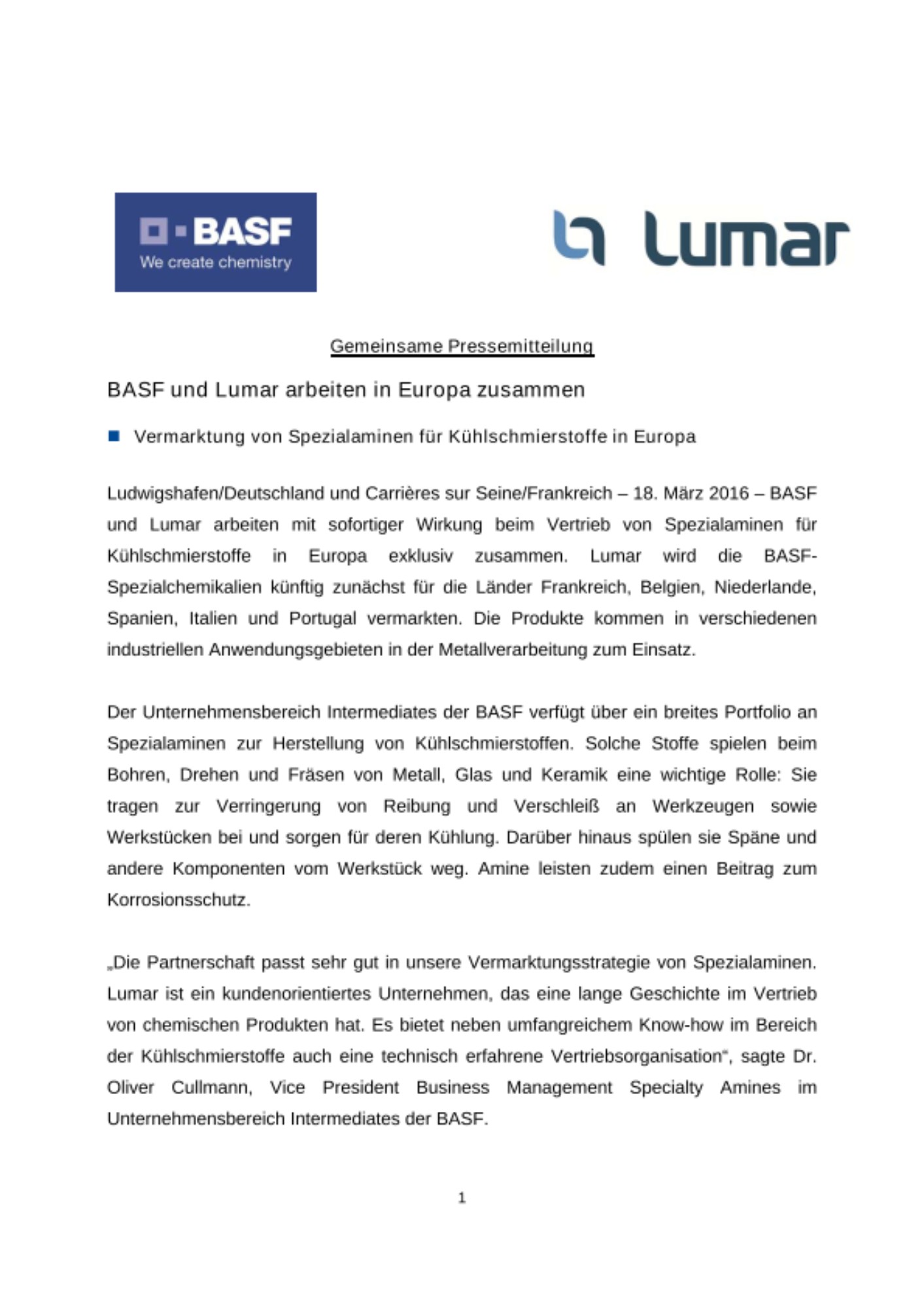 Ludwigshafen/Deutschland und Carrières sur Seine/Frankreich – 18. März 2016 – BASF und Lumar arbeiten mit sofortiger Wirkung beim Vertrieb von Spezialaminen für Kühlschmierstoffe in Europa exklusiv zusammen. Lumar wird die BASF-Spezialchemikalien künftig zunächst für die Länder Frankreich, Belgien, Niederlande, Spanien, Italien und Portugal vermarkten. Die Produkte kommen in verschiedenen industriellen Anwendungsgebieten in der Metallverarbeitung zum Einsatz.