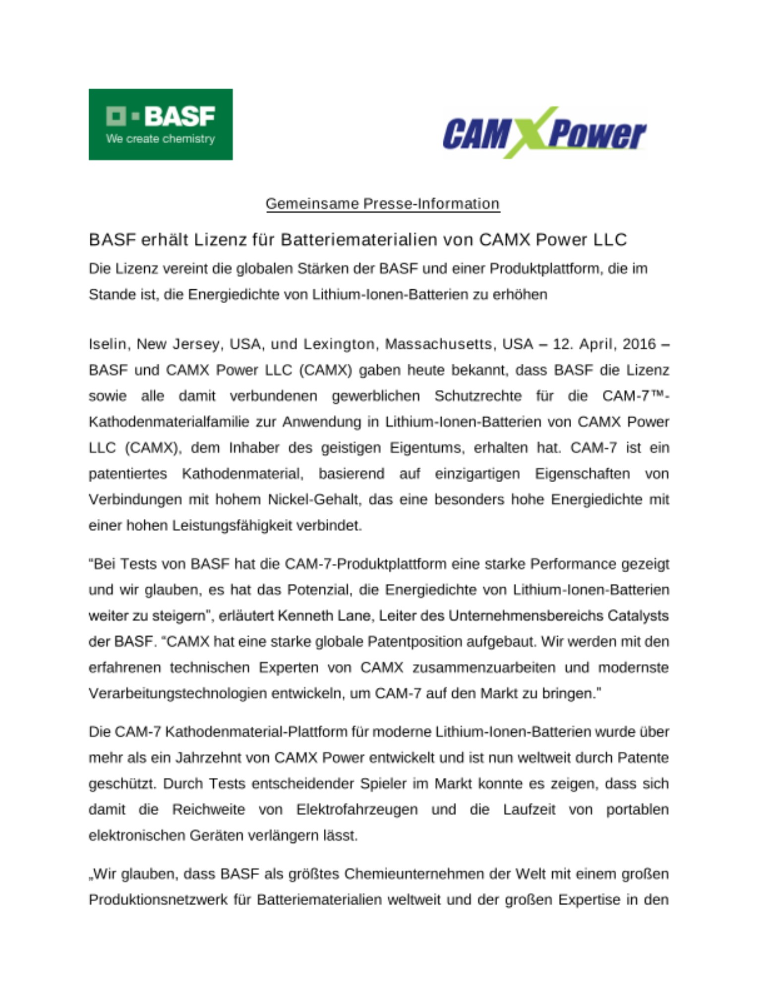 Iselin, New Jersey, USA, und Lexington, Massachusetts, USA – 12. April, 2016 –BASF und CAMX Power LLC (CAMX) gaben heute bekannt, dass BASF die Lizenz sowie alle damit verbundenen gewerblichen Schutzrechte für die CAM-7™-Kathodenmaterialfamilie zur Anwendung in Lithium-Ionen-Batterien von CAMX Power LLC (CAMX), dem Inhaber des geistigen Eigentums, erhalten hat. CAM-7 ist ein patentiertes Kathodenmaterial, basierend auf einzigartigen Eigenschaften von Verbindungen mit hohem Nickel-Gehalt, das eine besonders hohe Energiedichte mit einer hohen Leistungsfähigkeit verbindet.