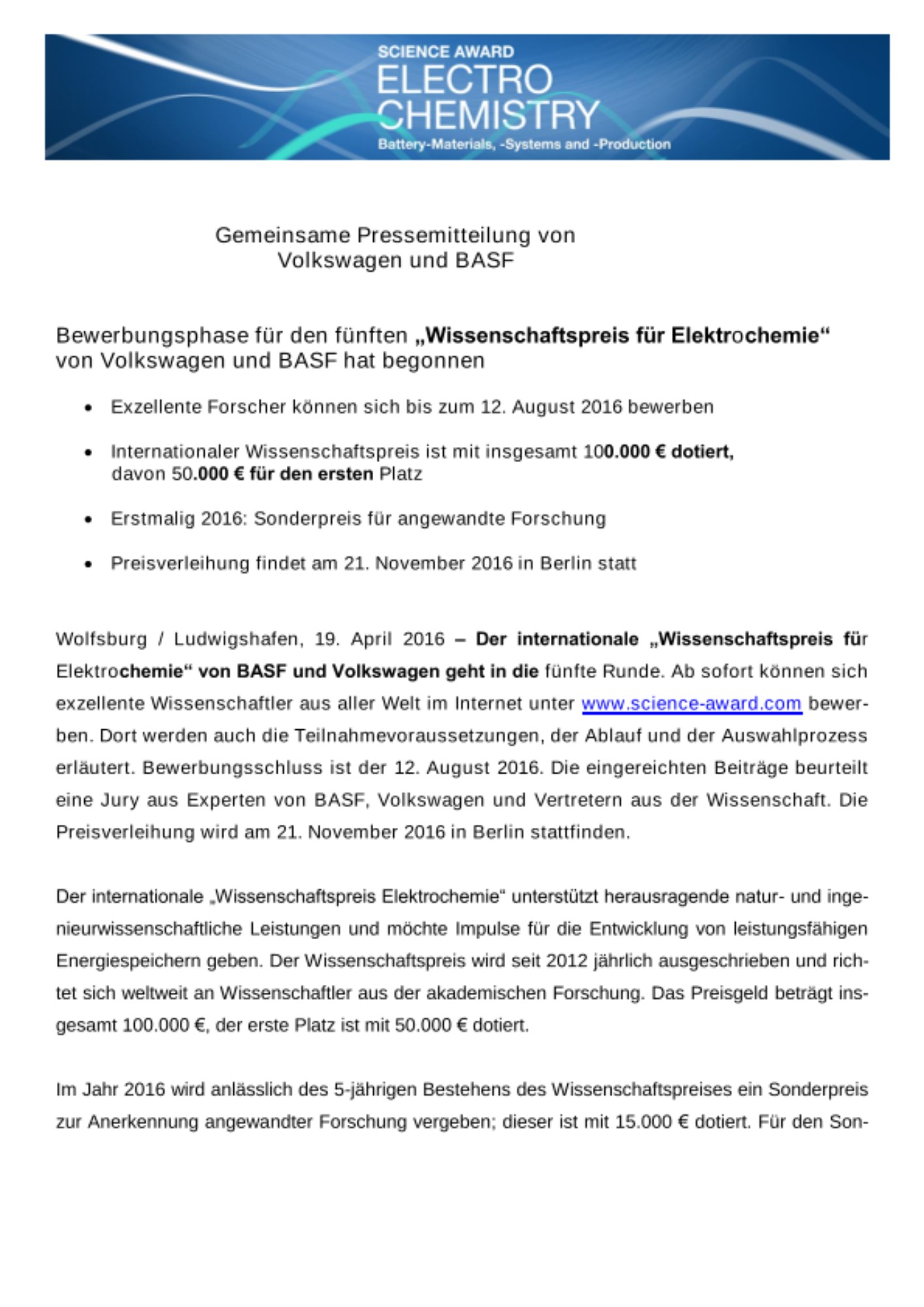 Wolfsburg / Ludwigshafen, 19. April 2016 – Der internationale „Wissenschaftspreis für Elektrochemie“ von BASF und Volkswagen geht in die fünfte Runde. Ab sofort können sich exzellente Wissenschaftler aus aller Welt im Internet unter www.science-award.com bewerben. Dort werden auch die Teilnahmevoraussetzungen, der Ablauf und der Auswahlprozess erläutert. Bewerbungsschluss ist der 12. August 2016. Die eingereichten Beiträge beurteilt eine Jury aus Experten von BASF, Volkswagen und Vertretern aus der Wissenschaft. Die Preisverleihung wird am 21. November 2016 in Berlin stattfinden.