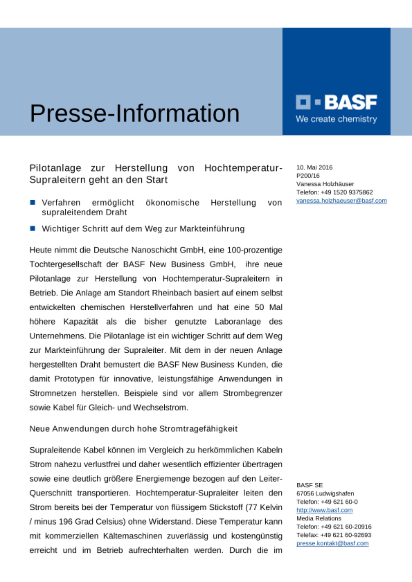 Heute nimmt die Deutsche Nanoschicht GmbH, eine 100-prozentige Tochtergesellschaft der BASF New Business GmbH, ihre neue Pilotanlage zur Herstellung von Hochtemperatur-Supraleitern in Betrieb. Die Anlage am Standort Rheinbach basiert auf einem selbst entwickelten chemischen Herstellverfahren und hat eine 50 Mal höhere Kapazität als die bisher genutzte Laboranlage des Unternehmens. Die Pilotanlage ist ein wichtiger Schritt auf dem Weg zur Markteinführung der Supraleiter. Mit dem in der neuen Anlage hergestellten Draht bemustert die BASF New Business Kunden, die damit Prototypen für innovative, leistungsfähige Anwendungen in Stromnetzen herstellen. Beispiele sind vor allem Strombegrenzer sowie Kabel für Gleich- und Wechselstrom.