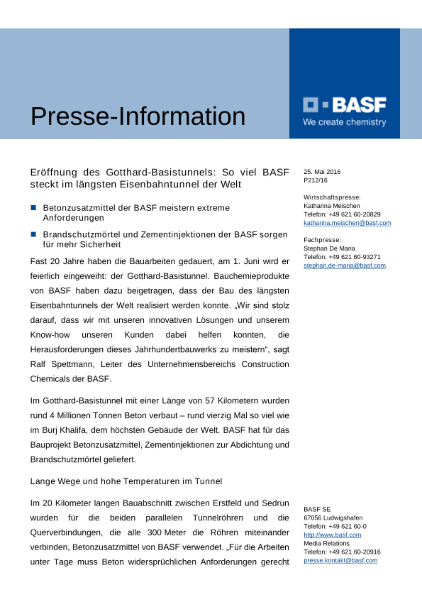 Fast 20 Jahre haben die Bauarbeiten gedauert, am 1. Juni wird er feierlich eingeweiht: der Gotthard-Basistunnel. Bauchemieprodukte von BASF haben dazu beigetragen, dass der Bau des längsten Eisenbahntunnels der Welt realisiert werden konnte. „Wir sind stolz darauf, dass wir mit unseren innovativen Lösungen und unserem Know-how unseren Kunden dabei helfen konnten, die Herausforderungen dieses Jahrhundertbauwerks zu meistern“, sagt Ralf Spettmann, Leiter des Unternehmensbereichs Construction Chemicals der BASF.