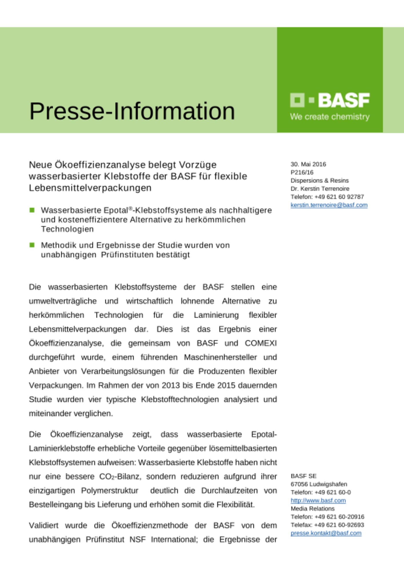 Die Analyse ergab, dass wasserbasierte Klebstoffsysteme von BASF lösemittelbasierten Systemen in ökologischer Hinsicht klar überlegen und über ihren gesamten Lebenszyklus weitaus umweltverträglicher sind. Wasserbasierte Epotal-Laminierklebstoffe erfüllen die Vorschriften für den Lebensmittelkontakt von EU und FDA (Food and Drug Administration / amerikanische Lebens- und Arzneimittel-behörde). Da sie weder organische Lösungsmittel noch aromatische Isocyanate enthalten, erhöhen sie bei ihrer Herstellung zudem die Sicherheit am Arbeitsplatz.