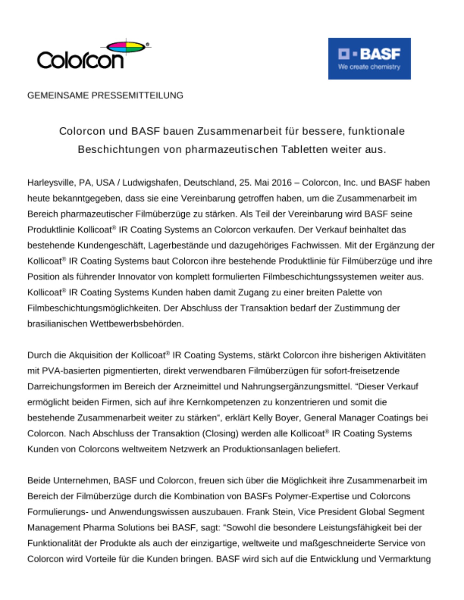Harleysville, PA, USA / Ludwigshafen, Deutschland, 25. Mai 2016 – Colorcon, Inc. und BASF haben heute bekanntgegeben, dass sie eine Vereinbarung getroffen haben, um die Zusammenarbeit im Bereich pharmazeutischer Filmüberzüge zu stärken. Als Teil der Vereinbarung wird BASF seine Produktlinie Kollicoat® IR Coating Systems an Colorcon verkaufen. Der Verkauf beinhaltet das bestehende Kundengeschäft, Lagerbestände und dazugehöriges Fachwissen. Mit der Ergänzung der Kollicoat® IR Coating Systems baut Colorcon ihre bestehende Produktlinie für Filmüberzüge und ihre Position als führender Innovator von komplett formulierten Filmbeschichtungssystemen weiter aus. Kollicoat® IR Coating Systems Kunden haben damit Zugang zu einer breiten Palette von Filmbeschichtungsmöglichkeiten. Der Abschluss der Transaktion bedarf der Zustimmung der brasilianischen Wettbewerbsbehörden.