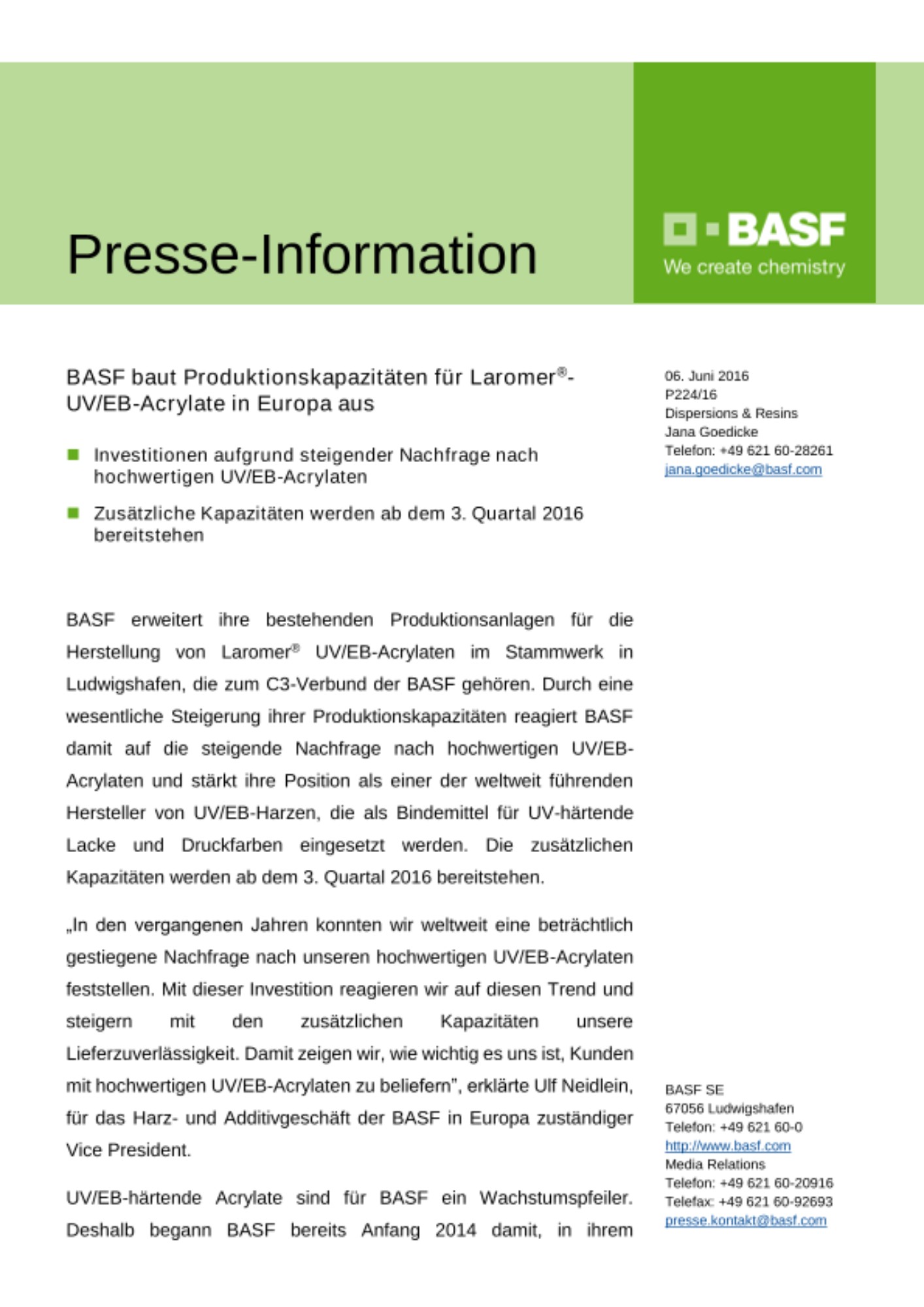 BASF erweitert ihre bestehenden Produktionsanlagen für die Herstellung von Laromer® UV/EB-Acrylaten im Stammwerk in Ludwigshafen, die zum C3-Verbund der BASF gehören. Durch eine wesentliche Steigerung ihrer Produktionskapazitäten reagiert BASF damit auf die steigende Nachfrage nach hochwertigen UV/EB-Acrylaten und stärkt ihre Position als einer der weltweit führenden Hersteller von UV/EB-Harzen, die als Bindemittel für UV-härtende Lacke und Druckfarben eingesetzt werden. Die zusätzlichen Kapazitäten werden ab dem 3. Quartal 2016 bereitstehen.