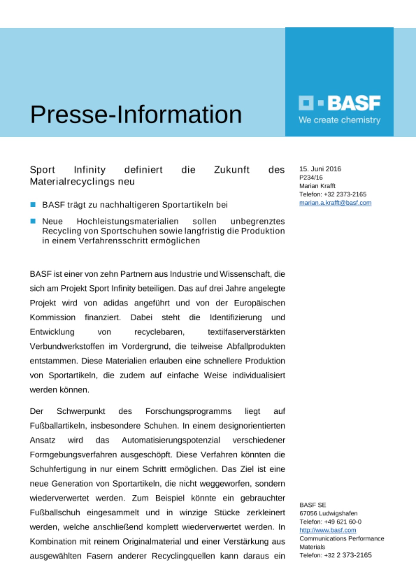 BASF ist einer von zehn Partnern aus Industrie und Wissenschaft, die sich am Projekt Sport Infinity beteiligen. Das auf drei Jahre angelegte Projekt wird von adidas angeführt und von der Europäischen Kommission finanziert. Dabei steht die Identifizierung und Entwicklung von recyclebaren, textilfaserverstärkten Verbundwerkstoffen im Vordergrund, die teilweise Abfallprodukten entstammen. Diese Materialien erlauben eine schnellere Produktion von Sportartikeln, die zudem auf einfache Weise individualisiert werden können.